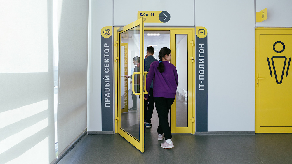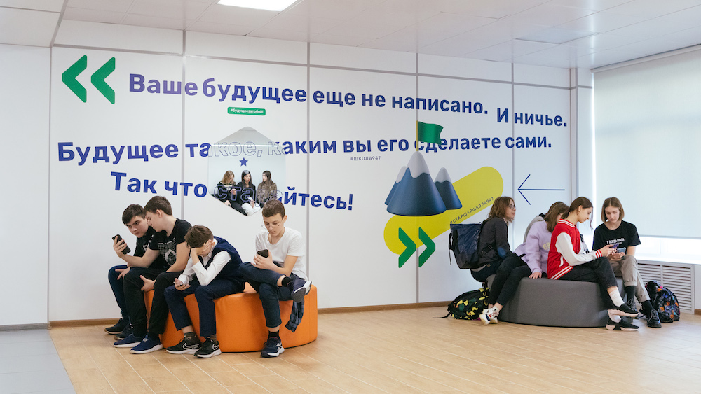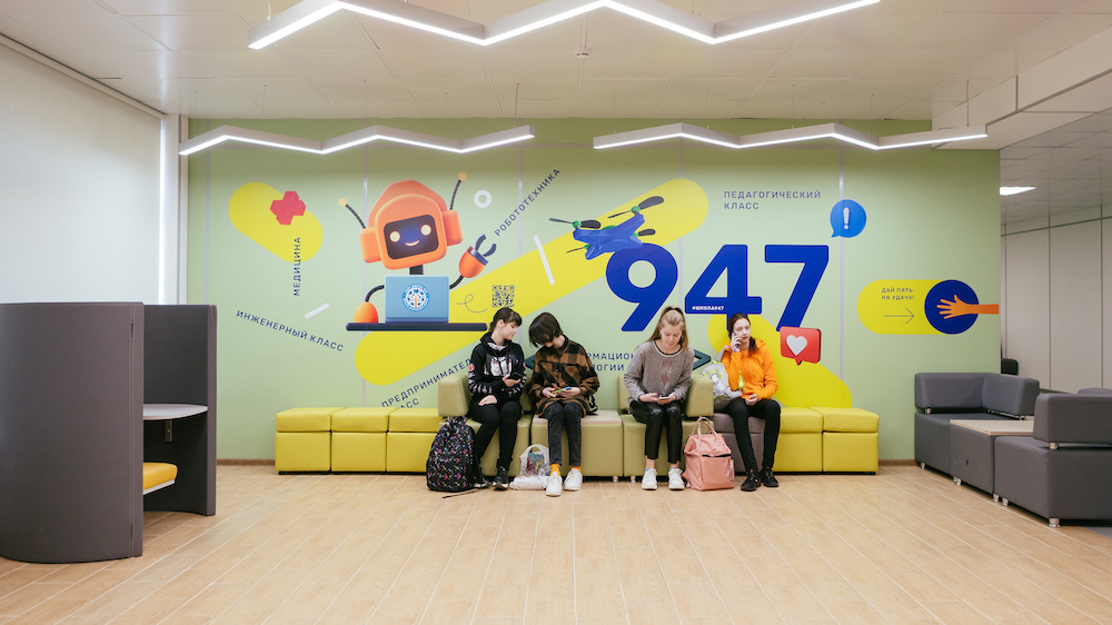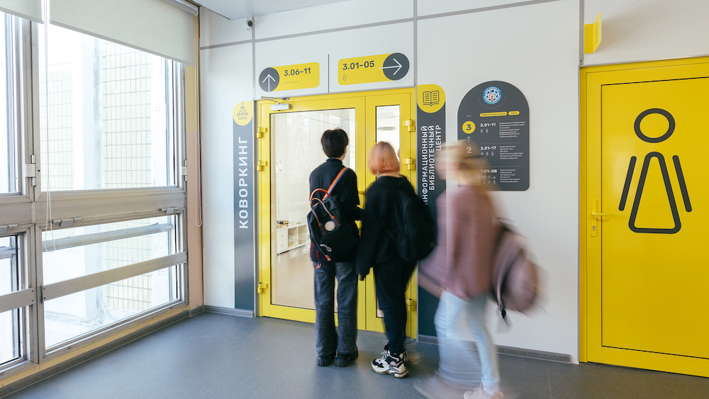 莫斯科第947学校经过整修后,拥有正方形走廊,每层设施尽不相同,在这样的环境中很容易迷路,因此邀请Sergey Scoler为其进行导视系统设计。