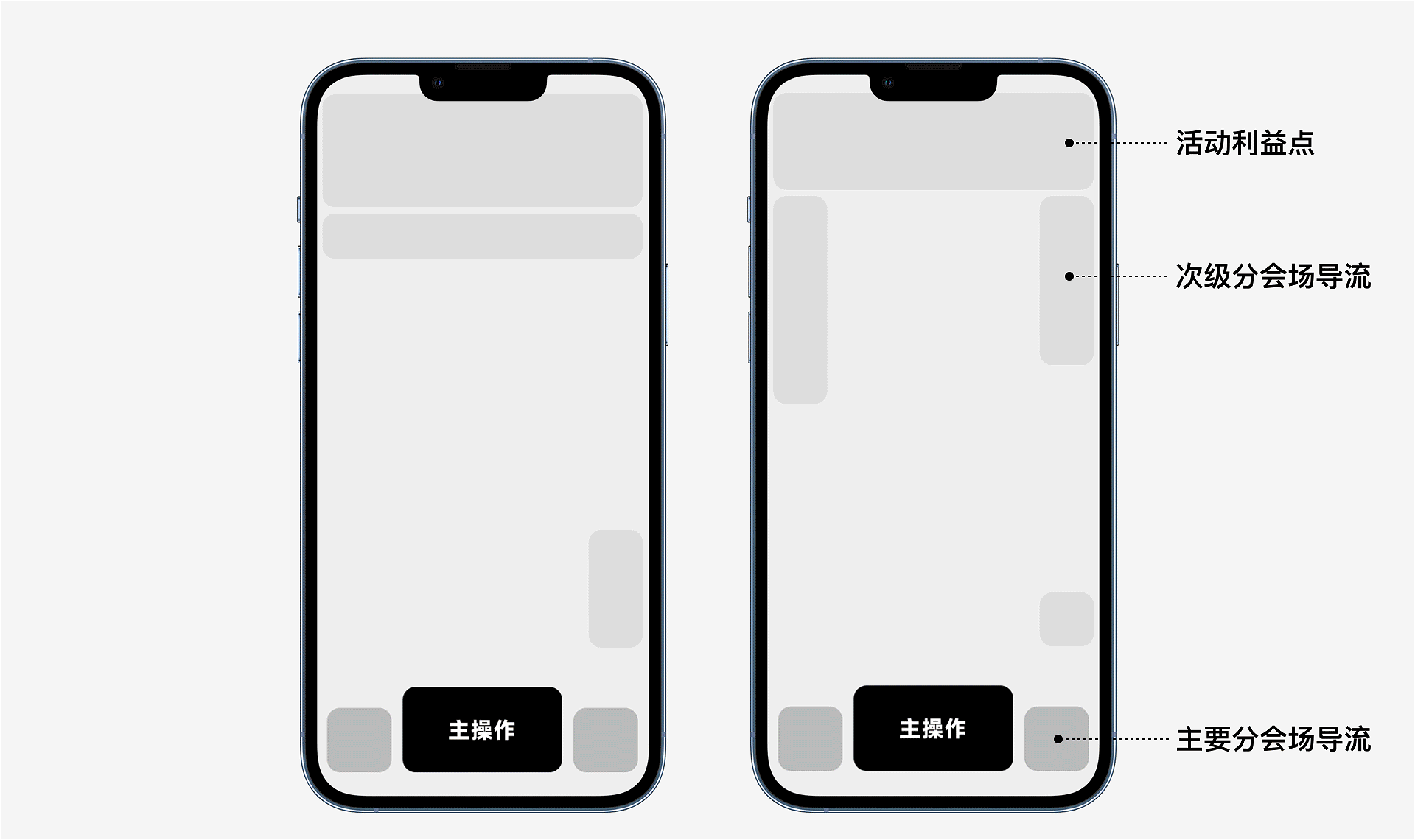 我们借鉴建筑空间序列划分的思路,通过标题区的利益点、场景展示区的操作进度和操作区的主操作行为的“路标”,帮助用户辨别方向。同时通过空间展示的差异化,进行分会场分流。