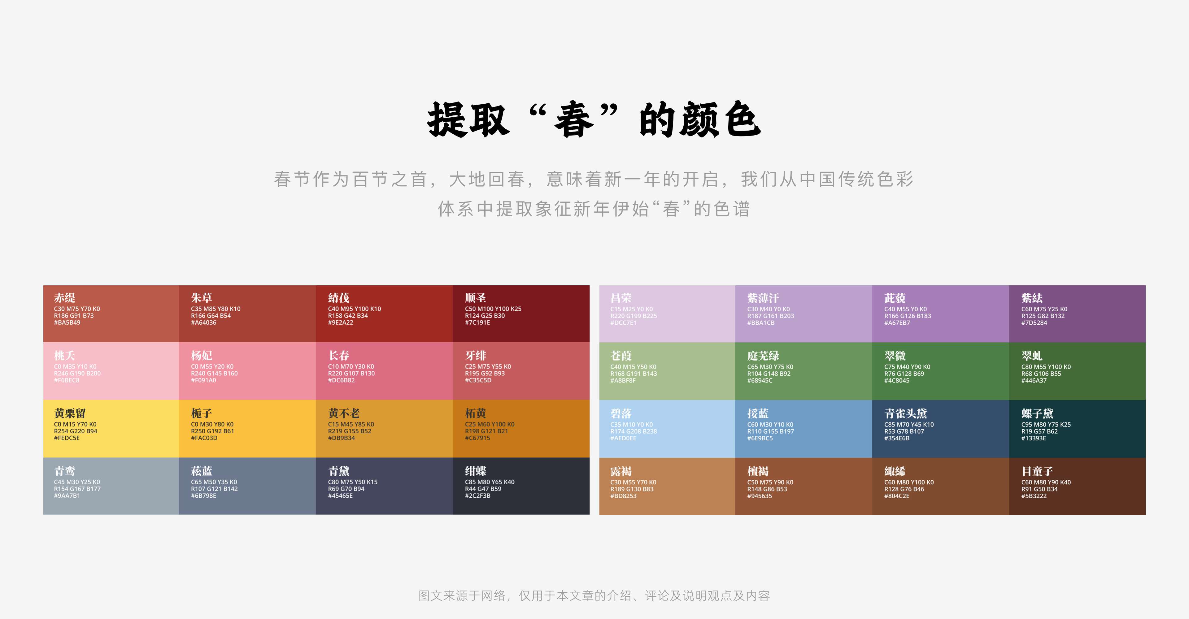 在色彩选用上,我们选取了中国传统色彩体系中象征新年伊始“春”的色谱。一方面增加用色的丰富度,同时在社会责任感层面,也是对中国传统文化的传承。