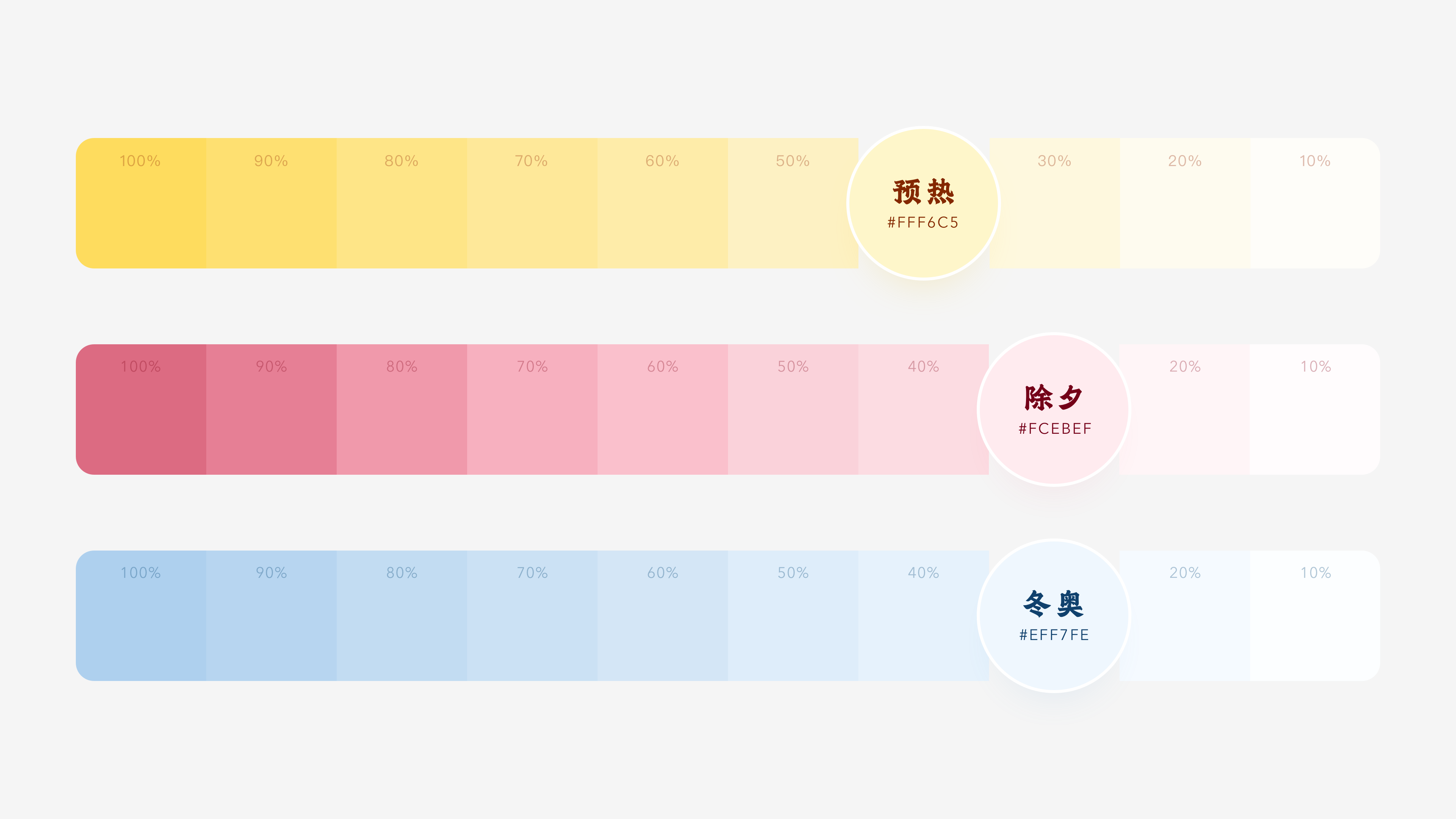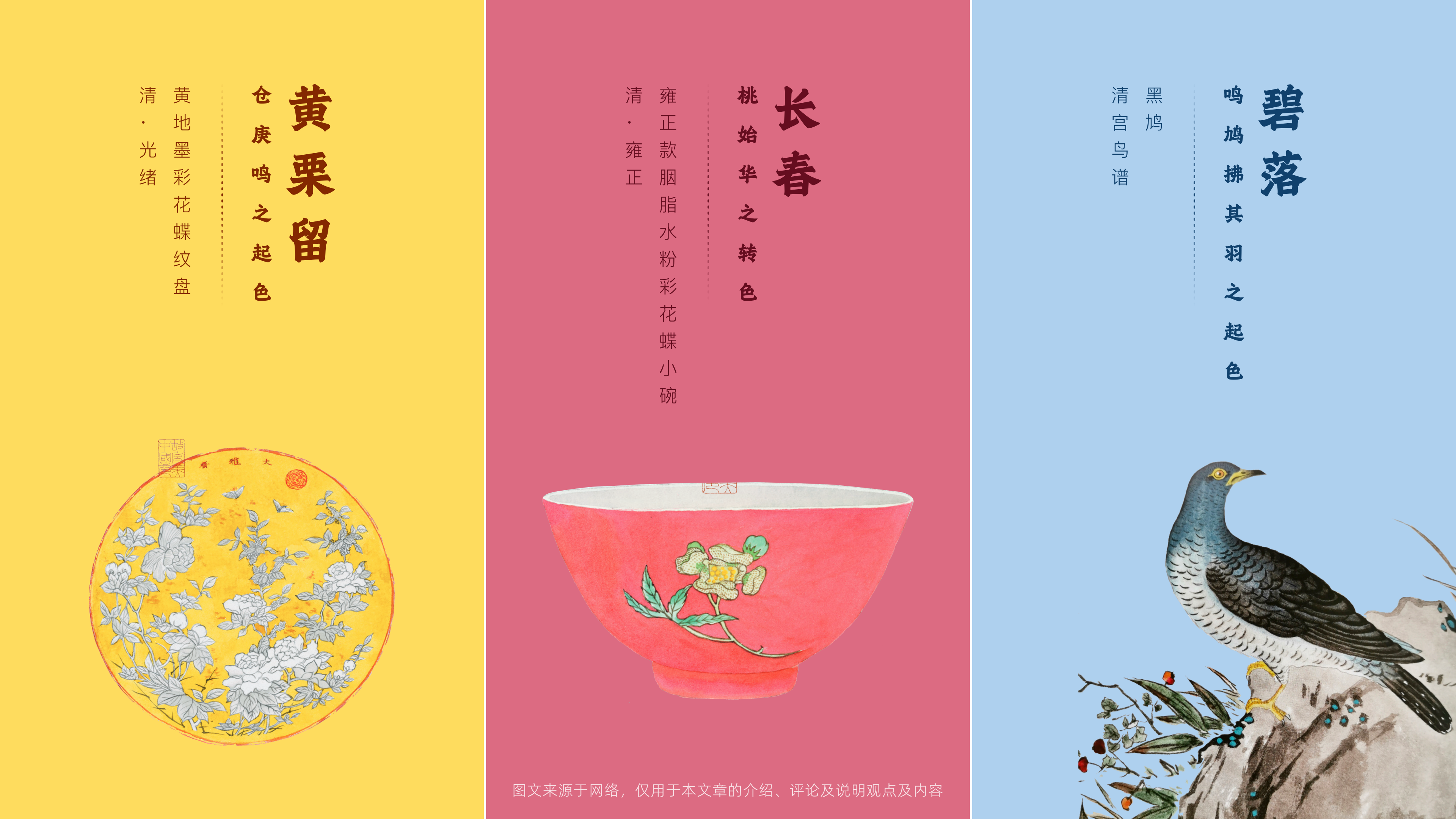 从色谱中提取三种色彩:黄栗留、长春、碧落,分别构成春节活动期间的预热会场、除夕会场、冬奥会场的色彩体系。