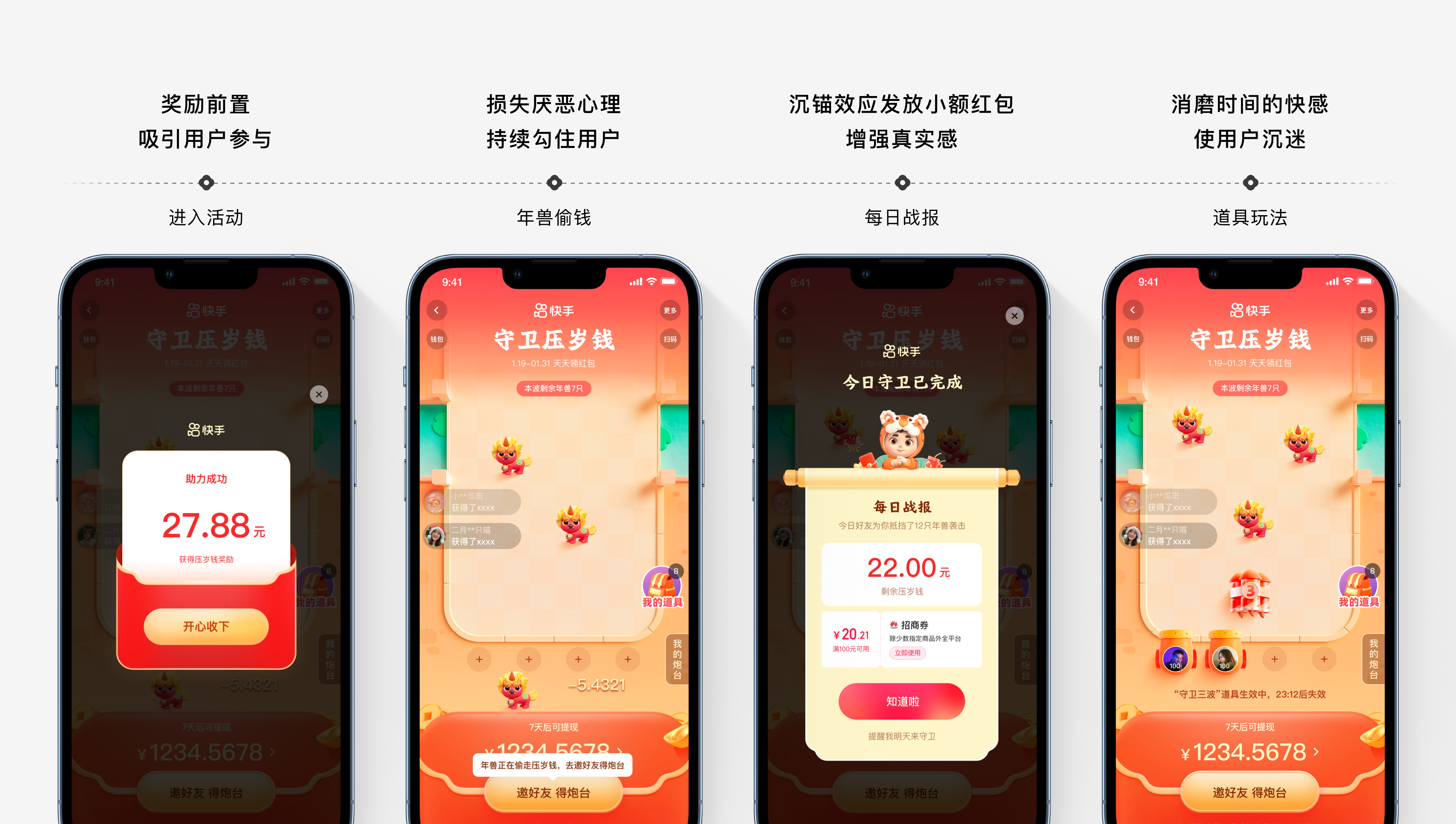比如:在守卫压岁钱会场中,“奖励”+“损失心理”的行为驱动。