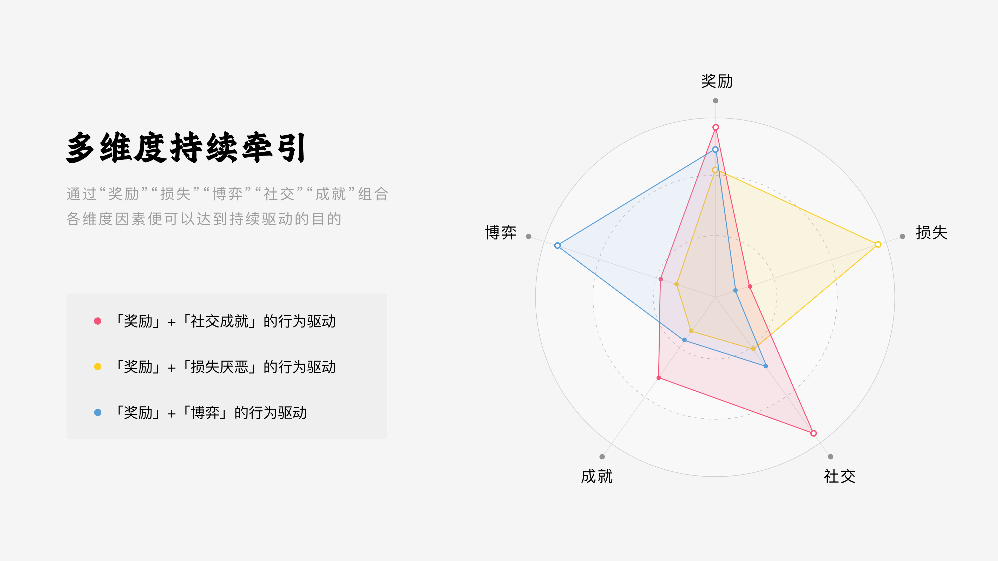 人性是行为的驱动力,也是让用户“一直玩”下去的动力。在游戏化活动中,“奖励”、“损失” 、“博弈” 、“社交”、“成就”构成了影响驱动力的雷达图,通过组合各维度因素可达到持续驱动的目的。