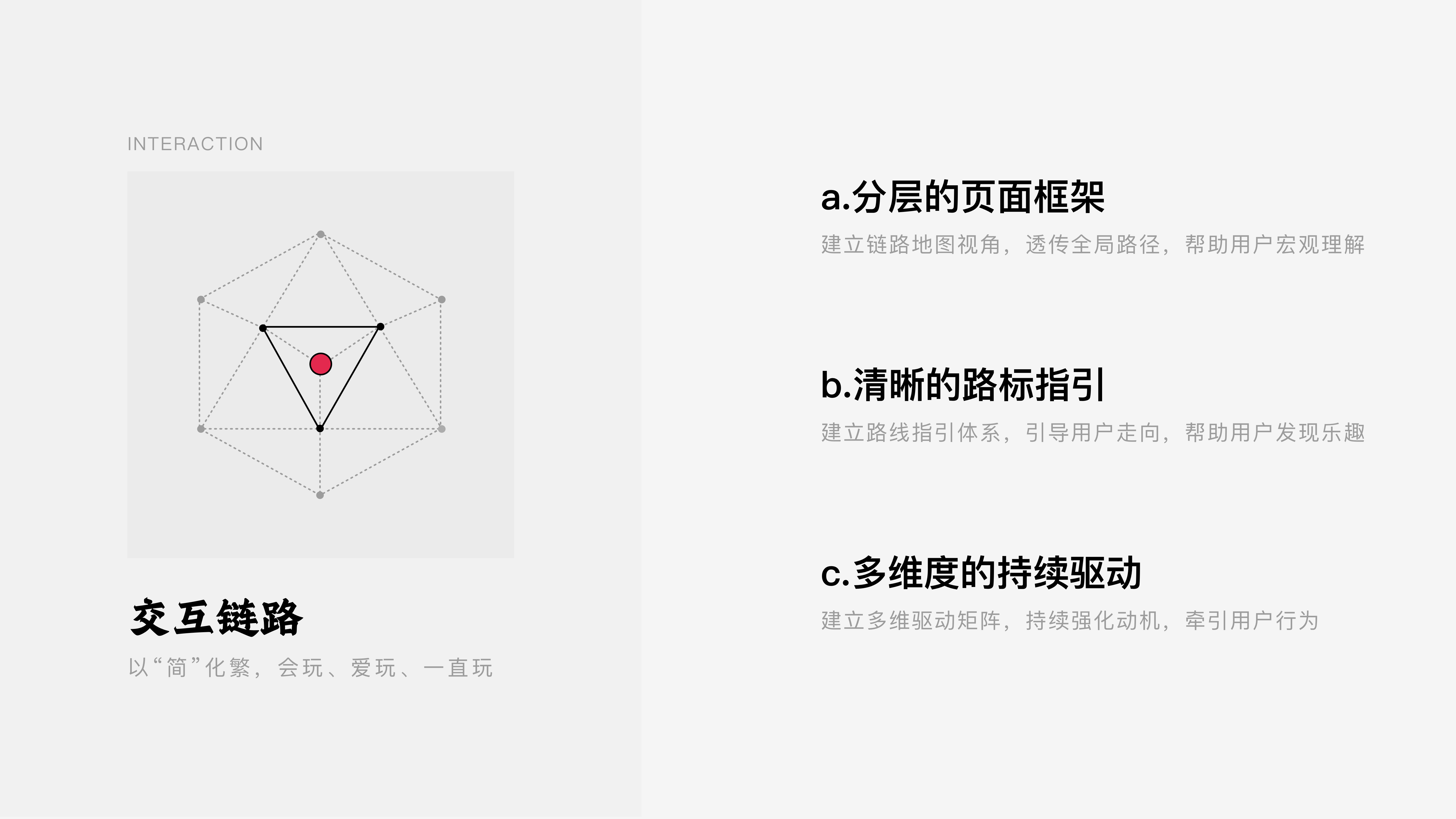 我们通过“框架分层、链路指引、多维度牵引”这三种手法对全局链路进行设计,在解决理解和易用的基础上让用户持续保持参与热情,从而达成让用户“会玩、爱玩、一直玩”的目的。