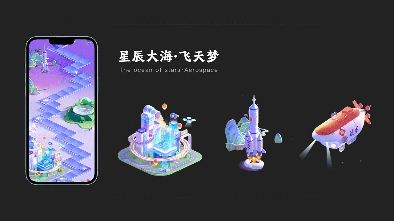 星辰大海场景中运用了向上演化光线粒子和快节奏的加速减速穿梭飞行器凸显5G科技感;潜水艇位移旋转的浮动和探头光的扫描体现蛟龙入海的真实感。