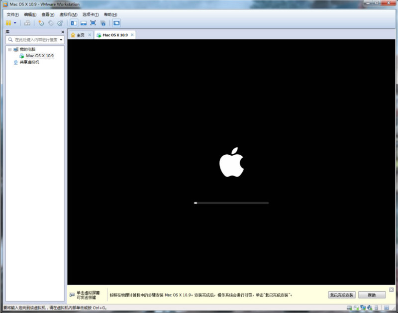 选择开启此虚拟机的按钮,如果没有什么错的话,苹果系统就会开始安装了。