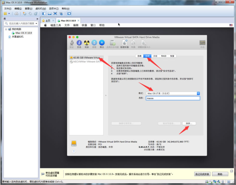 这里只有一个磁盘,在左侧的磁盘列表很容易找到,选择它,然后选择右侧的“抹掉”,格式选择 Mac OS 扩展(日志式),名称macos(自己起一个)。接着,抹掉!