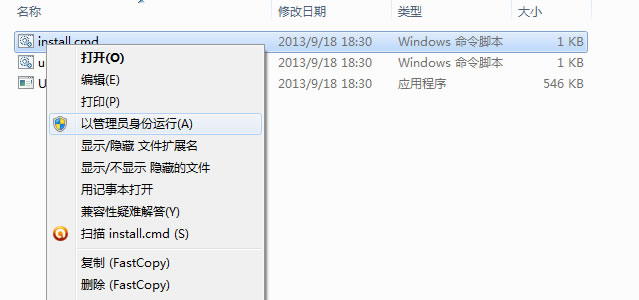 接着可以看到名为install.cmd的文件,右键,选择用管理员身份运行(vista,win7、8用户记得一定要选择以管理员方式运行,否则不会生效)。另外,安装这个的时候记得一定要关掉虚拟机软件,否则会失败。看着命令行中滚动的代码走完,窗口会自己消失。这个时候就安装完毕了。