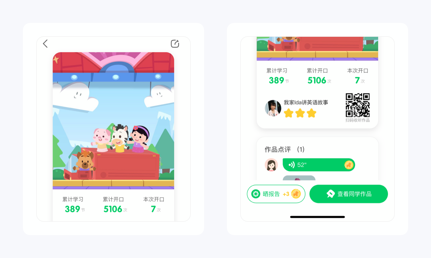 「学习周报」把小朋友每周的学习成果通过数据化展示,不仅可以一目了然查看本周的学习成果,而且能提升用户的传播欲望,其次对家长来说,这就像一个孩子当周的学习数据看板,对孩子的学习有清晰直观的了解。
