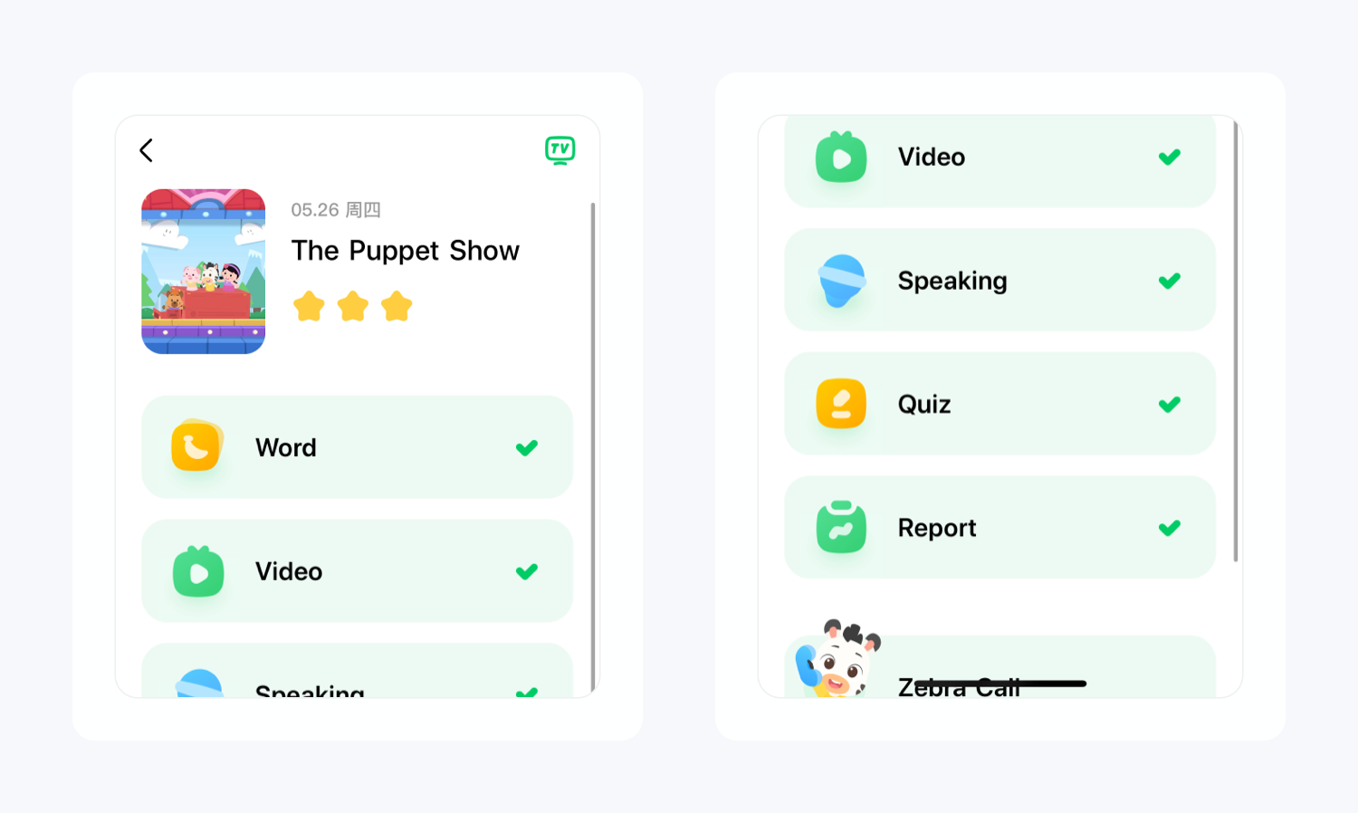 课程划分为不同的小节,这可以把学习时间分割,降低行动成本,让小朋友可以轻松开始学习。以阅读课程为例,先从一个趣味性的故事开始,激发小朋友的兴趣,再通过听、说、读、练的步骤,让小朋友加深对课程的理解,最后生成学习报告。