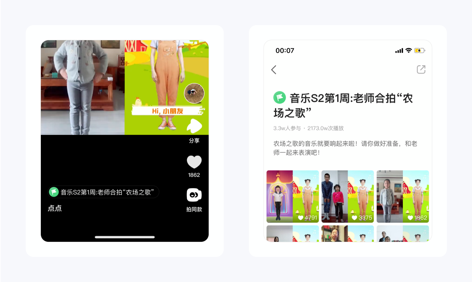 ⑵左下角为该视频所关联的课程,点击后可查看当节课程所有小朋友录制的课程,这可以利用从众效应引导小朋友录制视频,提高用户活跃度和学习的趣味性。右下角点击拍同款以后,小朋友就可以开始跟着视频的模板进行录制,让一款学习产品充满了娱乐性,多变又好玩。