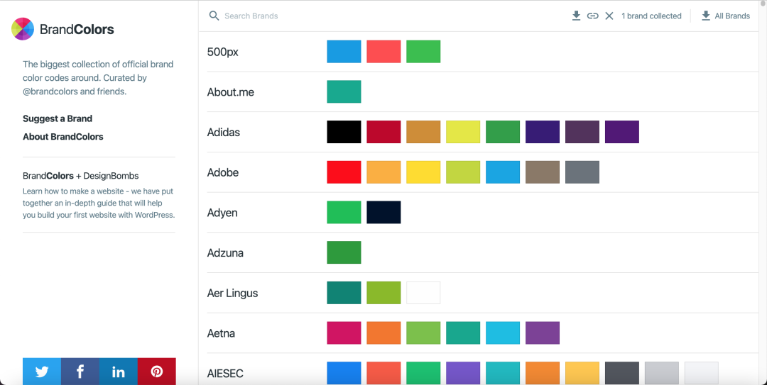 BrandColors 由DesignBombs创建。目标是为最常用的品牌颜色代码创建一个有用的参考。它已被 Smashing Magazine、CSS-Tricks、Web Design Depot、Tuts+ 和超过200 万次网页浏览量推荐。现在有600 多个品牌,拥有1600 种颜色,并且该系列一直在增长。