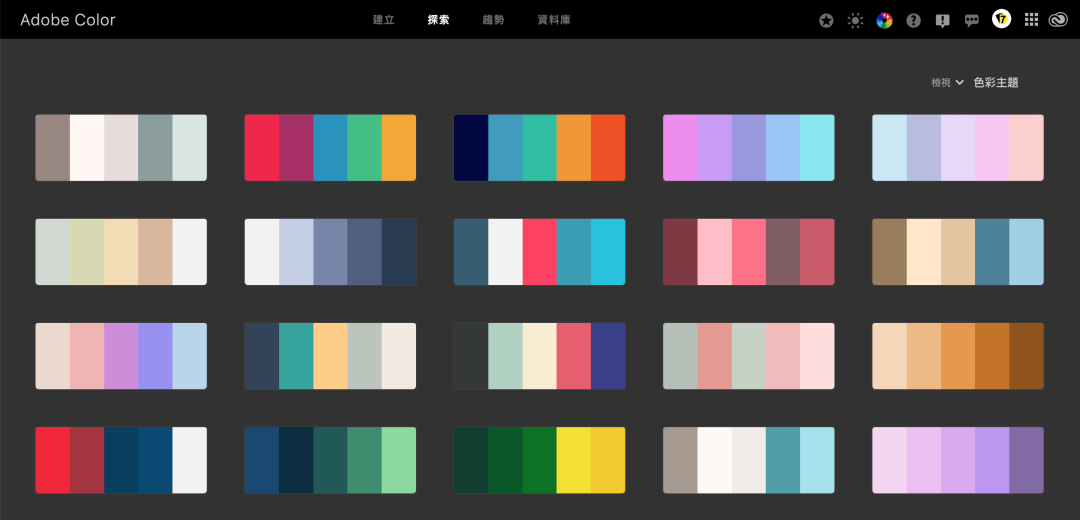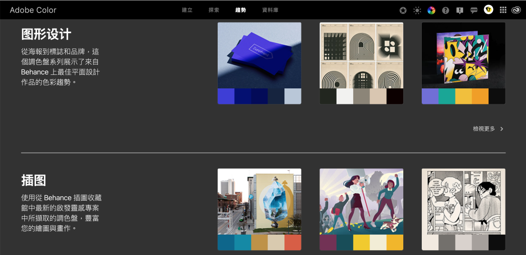 从 AdobeColor 社区、Adobe Stock 图像和 Behance 项目中寻找最受欢迎的色彩搭配。