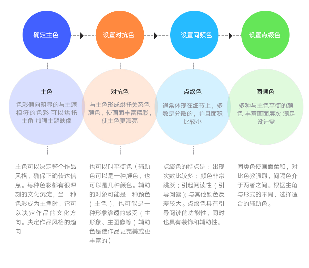2.确定色彩的流程一般为:确定主色-设置对抗色-设置同频色-设置点缀色