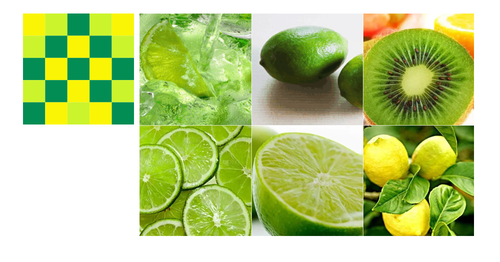[酸]:会使人联想到未成熟的果实,因此酸色即以绿色为主。从在果实成熟的过程中的颜色变化进行理解,黄色、橙黄色、绿色等,都带有微酸味的感觉
