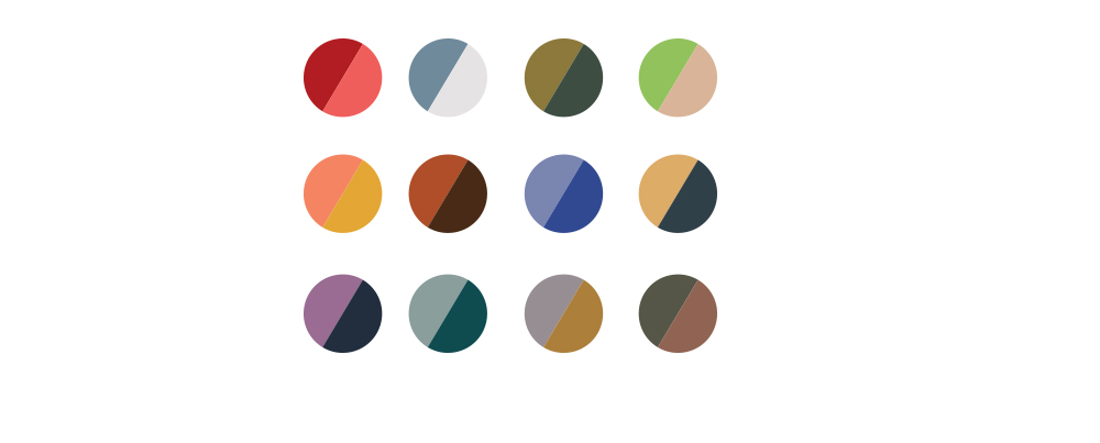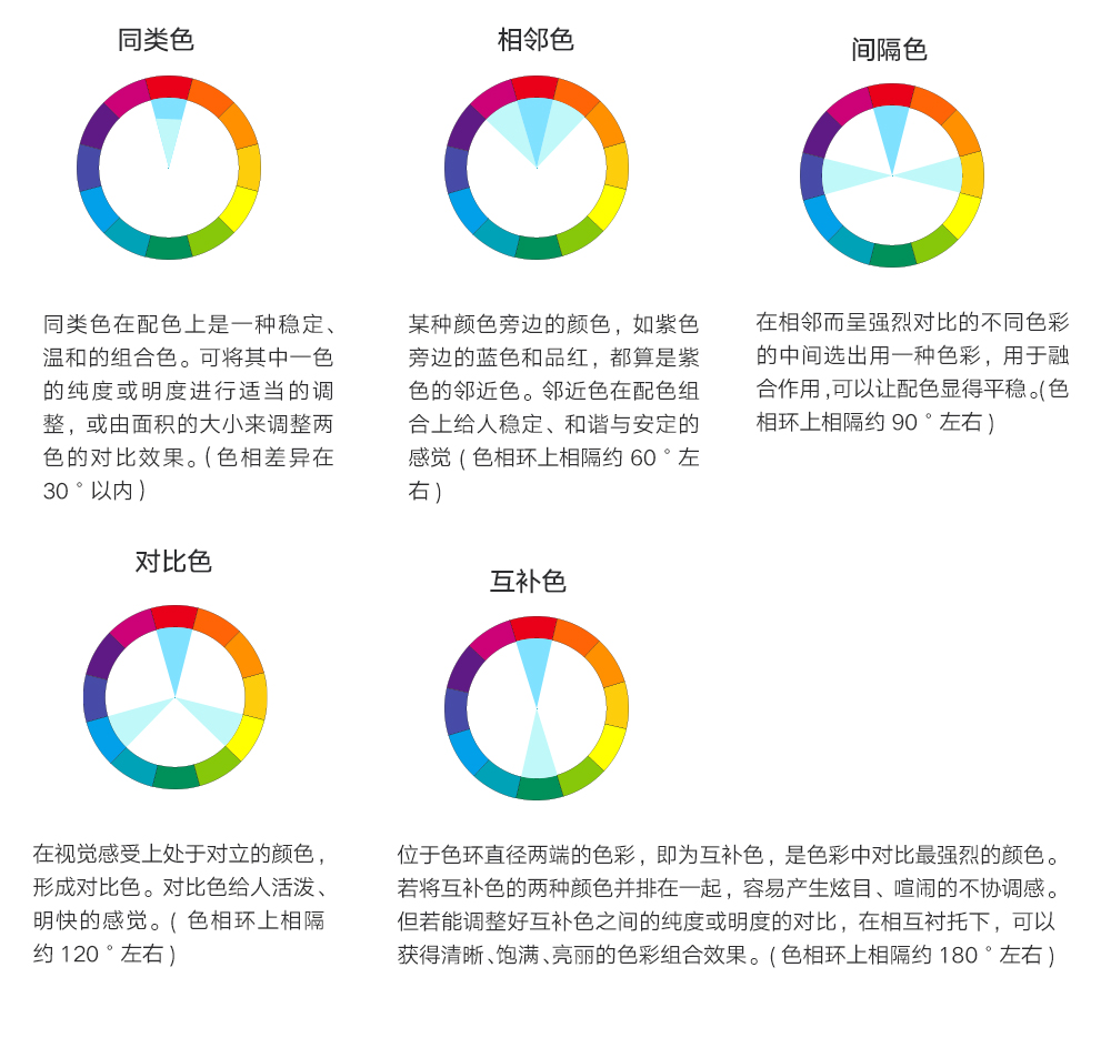 根据色彩在色相环上的位置,总结出一些常用的色彩搭配方法。一般包括对比色,互补色,同类色,相邻色,间隔色。