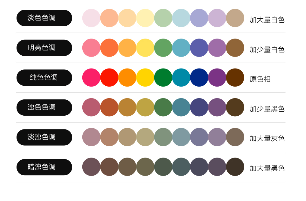 从纯度上分,有鲜色调、浊色调、淡色调。