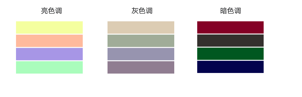 从色彩明度上划分,有亮色调、暗色调、灰色调。