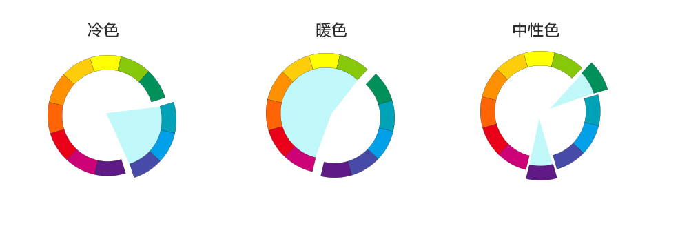 指色彩的冷暖倾向,在生活中或绘画上的色彩,总会给人以或冷或暖的感觉和联想,如倾向蓝、蓝绿、蓝紫等为冷色,倾向红、橙、黄等为暖色。冷色容易使人感觉寒冷,暖色则使人产生温暖的感觉。紫色和绿色,介于冷色和暖色之间,有时会因倾向暖色而有暖和感,有时会因倾向冷色而有寒冷感,因此称为中性色。此外,色彩的冷暖是相对的,如红比黄就暖一些,黄比蓝就暖一些。