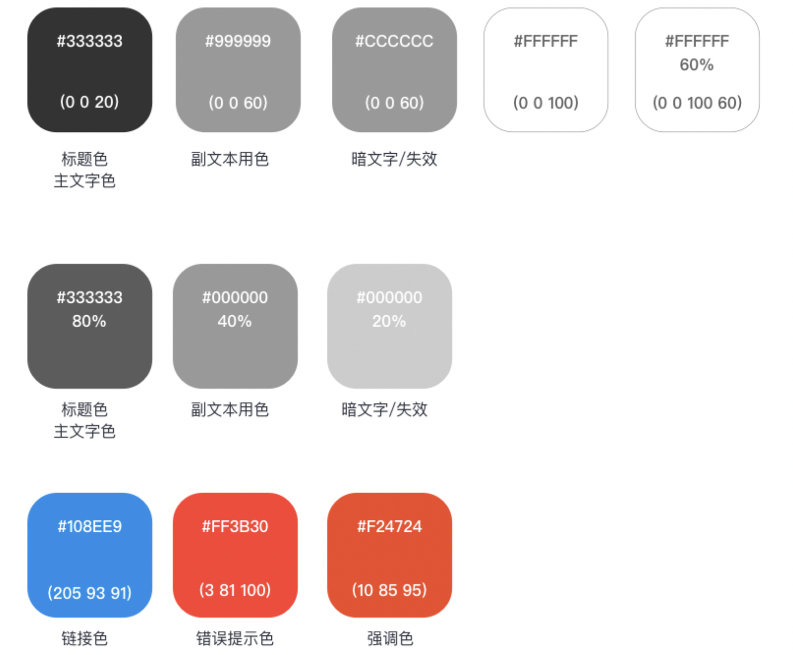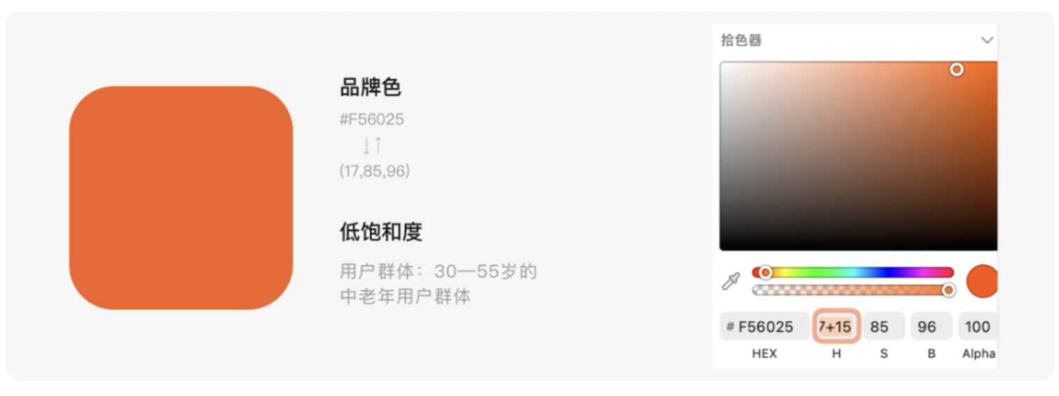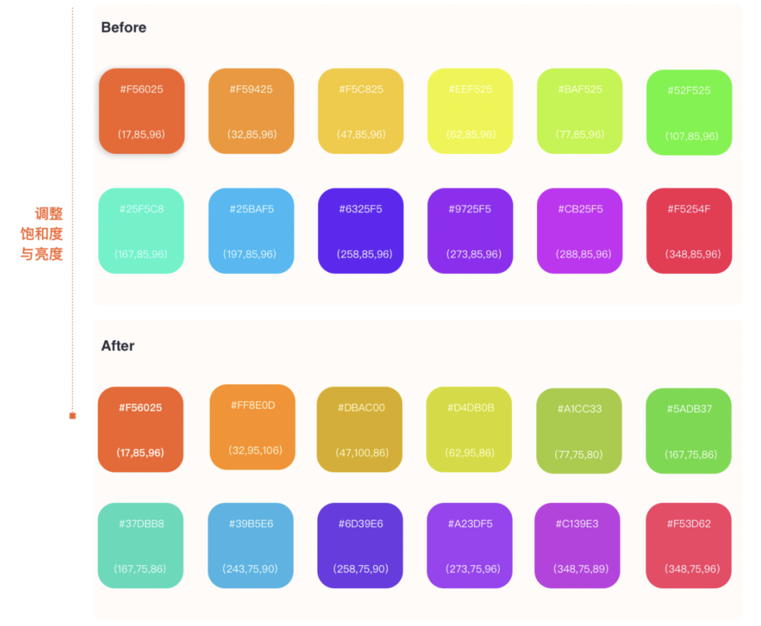 由于色彩本身自带感官明度属性,所以我们看到的颜色会有反差不是那么令人满意,这时候需要根据我们公司用户人群去调整同频辅助色,可以在亮度(B) 按+10,-10去调整,原則有对比度,需要明显;也可以调整饱和度(S) 按-10,+10去进行调整,需要注意的是以上只是科学的调整方式不代表需要严格按照,加减的数值可以是不一样,没有固定的数值,具体情况需要根据实际内容去调整符合品牌的辅助色