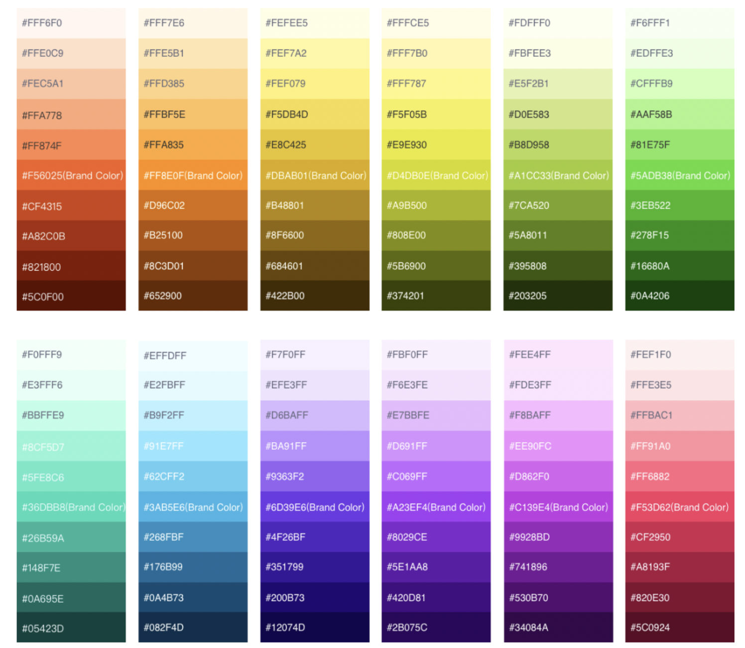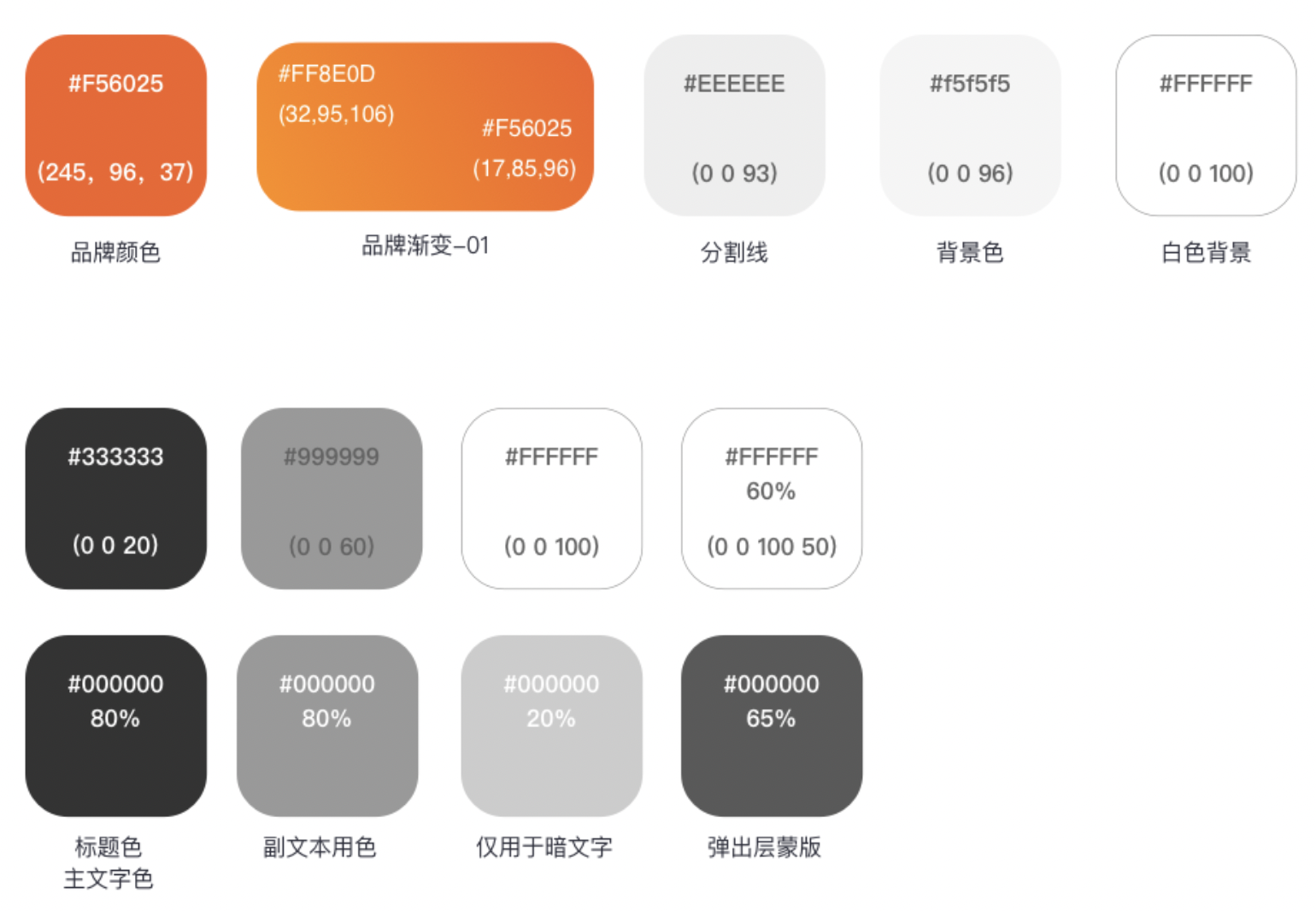 得出色板之后,同理可以得出我们的渐变色;建议跨度两个色阶(同色系或者邻近色),对角线渐变;我们需建立完整的调色板来满足不同场景下颜色的使用,以传达品牌精神,建立色彩层级,或传达信息,或强化界面层级。