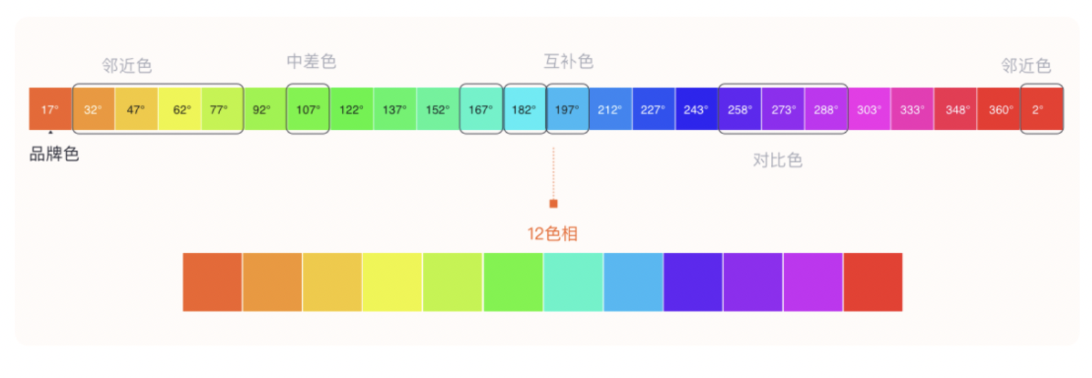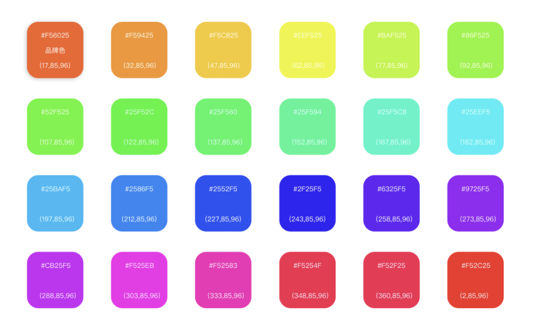 首先定义一个品牌色,在品牌色的基础上,S和B不变调整,以品牌色的H(色相)为基础,增加或减少15度(色相环是360度,每个色相环是15度,得出24色相,24*15=360);以此类推,从而我们可以在0-360之间得到24个颜色
