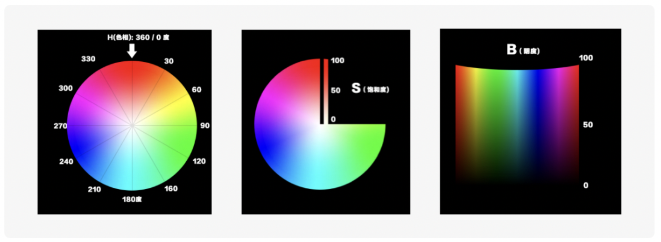 - H就是“色相”:所谓“色相”,指的就是像红色或者蓝色这些色调的称呼,也就是它们的面相