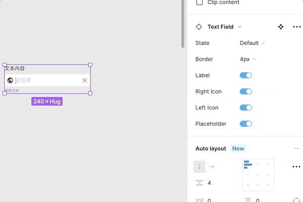 主组件设计好后,接下来增加变体,设置属性就行了,这里不赘述。figma 的组件的优势是父子组件关系,所以父组件的设计完成度很重要,而变体是根据你的父组件改变的,变体属性则根据你的需要(状态、边界、占位符)设置。