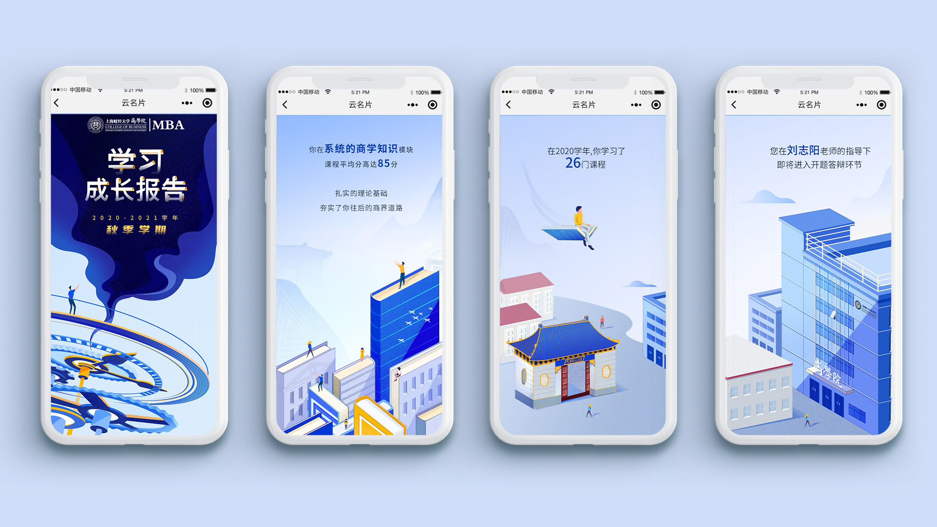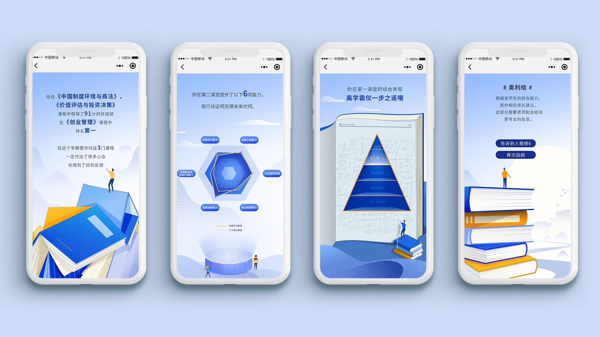 上海财经大学EMBA想到定制一份“网易云年度报告”式的学生成长报告时,不懂技术的广告公司和不懂创意的技术公司退却了,咖墨迎接了这份挑战。在创意内容输出的背后,是对教学体系、数据结构的一次次梳理与优化,技术组合的尝新探索。较之传统成绩单的平铺直叙,咖墨开发的小程序报告将数据做了可视化的设计,并设定了教学对比反馈的程序功能,让学生能够客观地了解自己的学习状态,同时,有向榜样学习的前进动力。