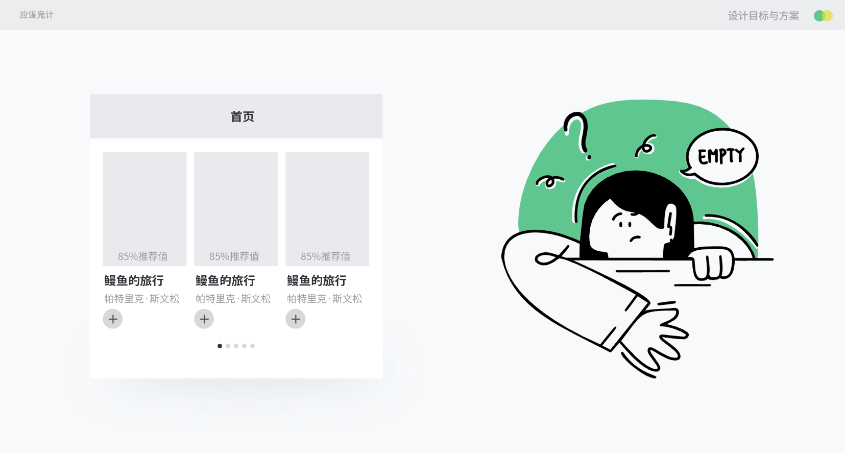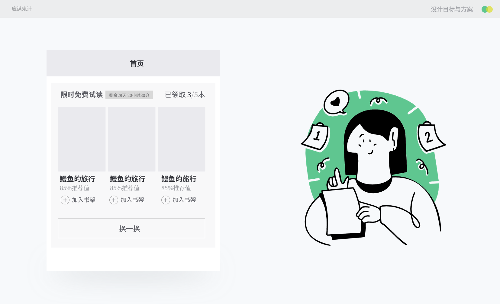 方案具体要呈现的逻辑、样式,其实还是取决于设计目标(拆分于业务目标)。例如这个模块应该出现在什么位置、出现的规则和逻辑是怎样的,书籍的选择交互是什么形式,这些都要思考。