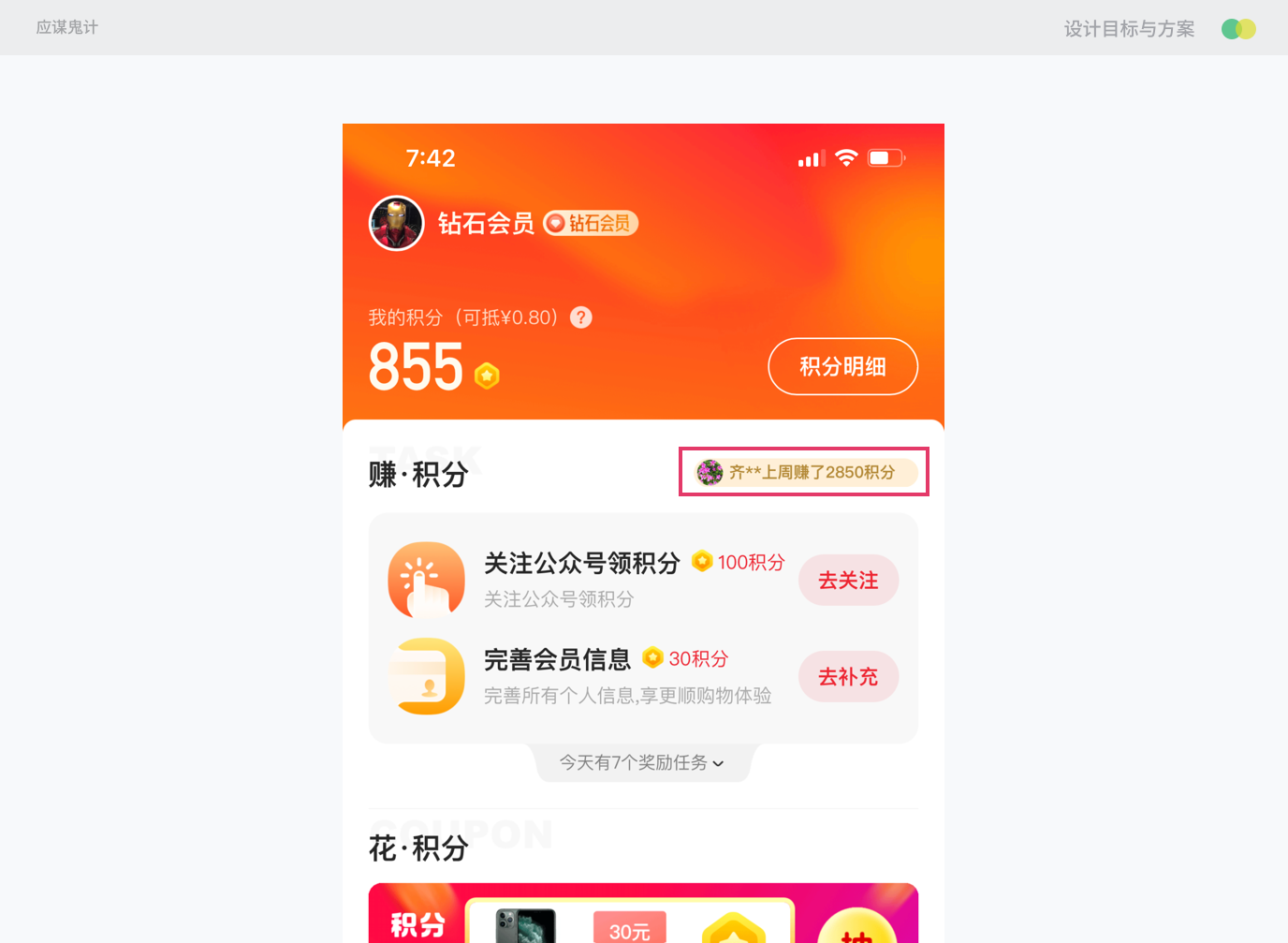 设计目标:如何达成业务目标?1.让用户感知到积分的作用2.能够营造一种积分兑换的热闹氛围