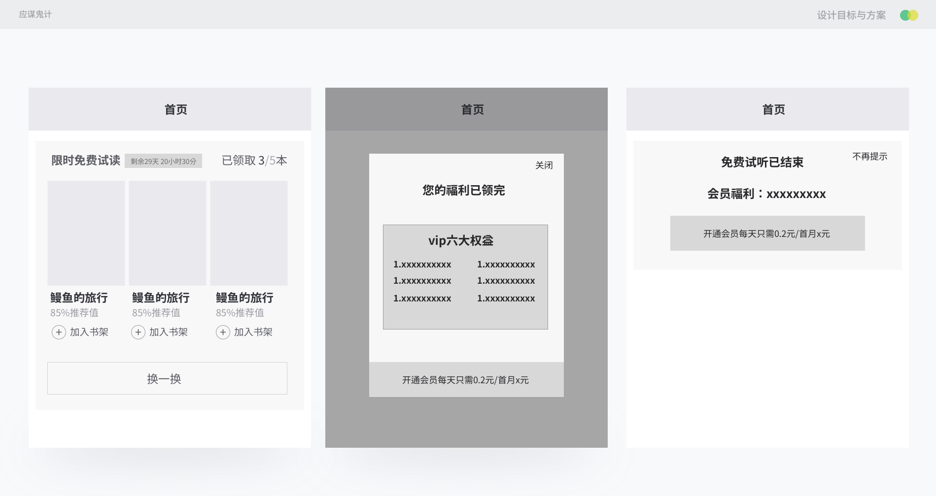 发放福利只是一种手段,最后的目的不是单纯的给用户福利,而是让用户能够加入vip。所以需求的业务目标是提升vip的转化,才会有相应的设计目标,为了提升vip的转化,我们才做了一个新人免费阅读5本书的福利。这样一个业务的目标才能闭环起来。当用户领取完5本书后我们可以给一个加入vip的弹窗,告诉其权益让用户自己选择,那么这条需求的路就走完了。我们最后来看一下这个需求的完整方案。