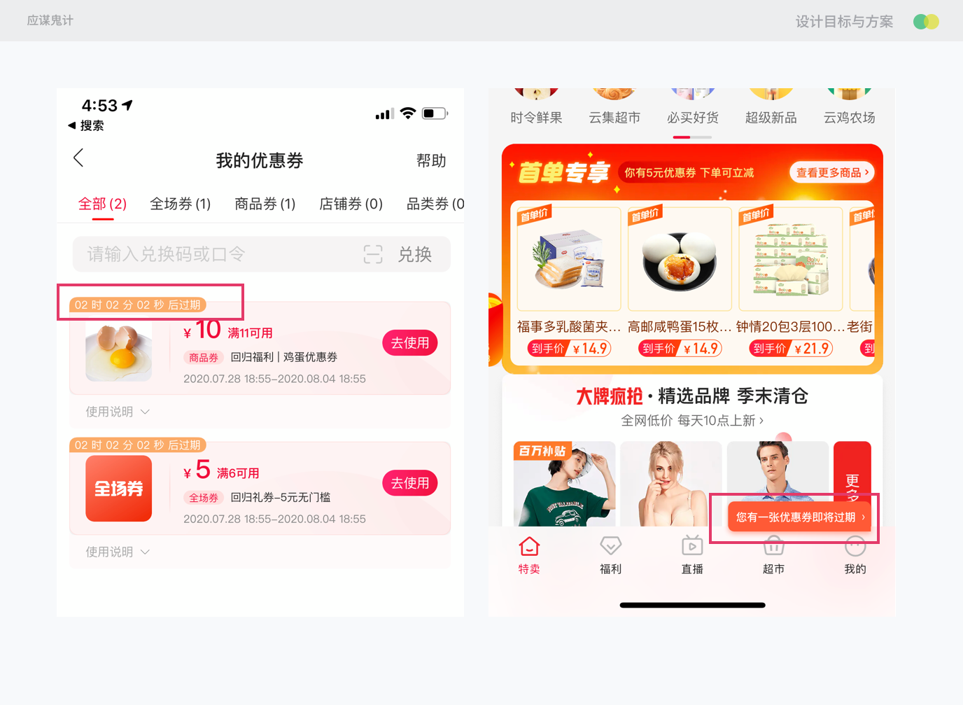 设计目标:如何提高使用率呢?这里可以拆分位两个场景:1.用户当前有新优惠券(不包含快过期的)的使用提醒 2.针对用户快过期的优惠券的使用提醒。