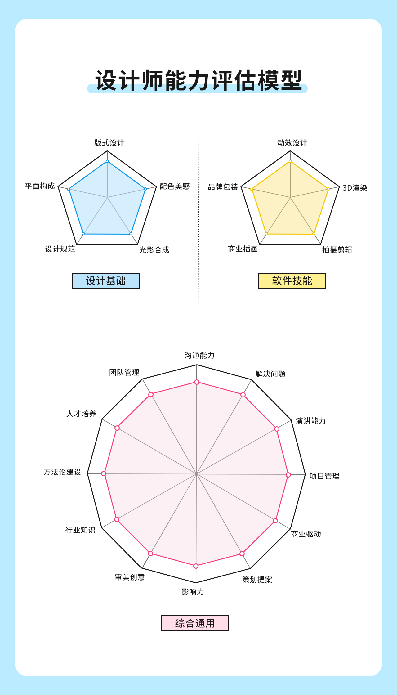 下图是根据个人经验以及书本资料总结的设计师能力评估模型,分别从设计基础,软件技能,综合通用三个方向进行框架参照: