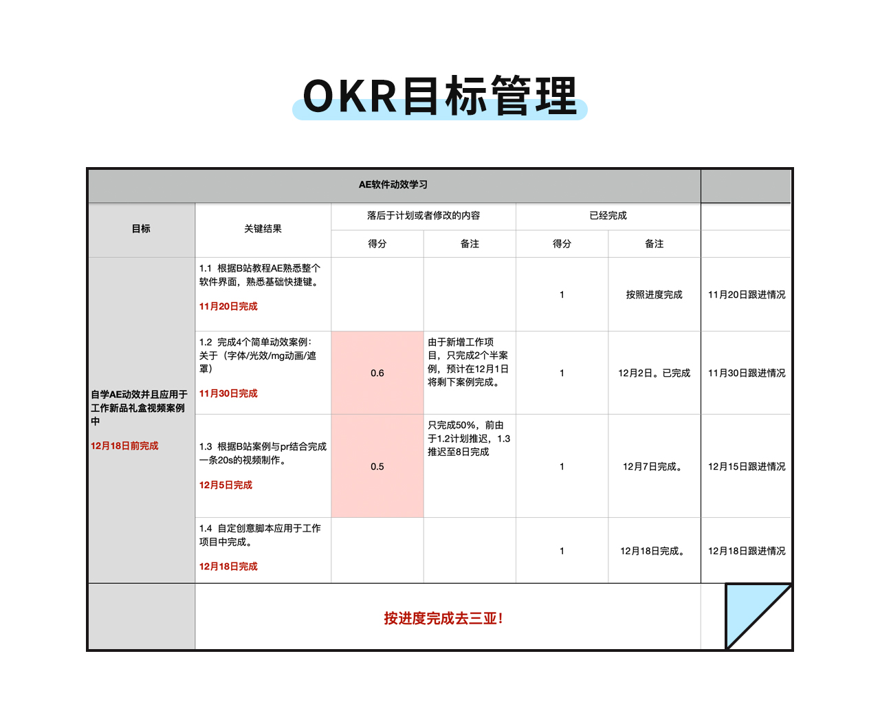 一定要根据个人时间,按照OKR目标管理的形式定制计划表,设置目标,详情见下表案例: