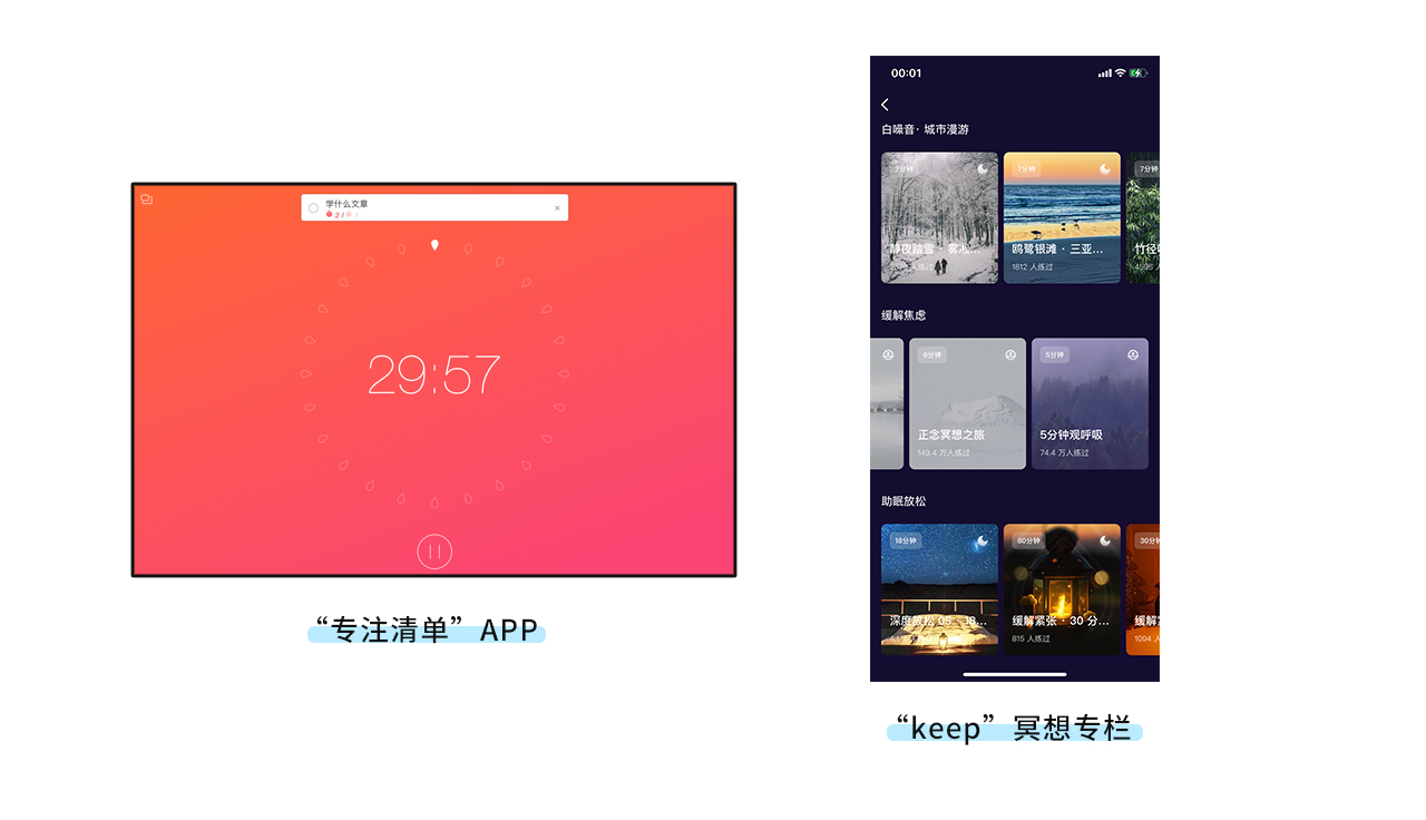 冥想:这里就推荐最简单的观呼吸,观察自己的呼吸,越来越慢的状态,亲身体会只需3-5分钟,好比给大脑做了一个SPA,可以跟着keep里面的冥想栏目练习。
