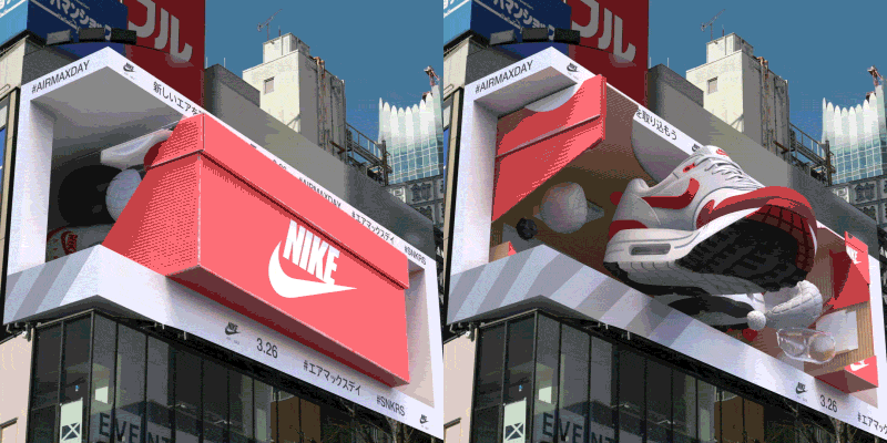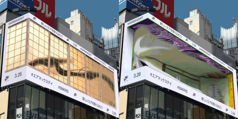 在最近给耐克AIRMAXDAY制作的影像作品中,我又尝试了一些新的挑战:在所做的新宿3D OOH中,让广告飞了出来!还由此产生了“未来到来了!”等系列热搜和超话,我的这些理念与《汉字城市》和《haku》相同,都是使用错觉来表达。