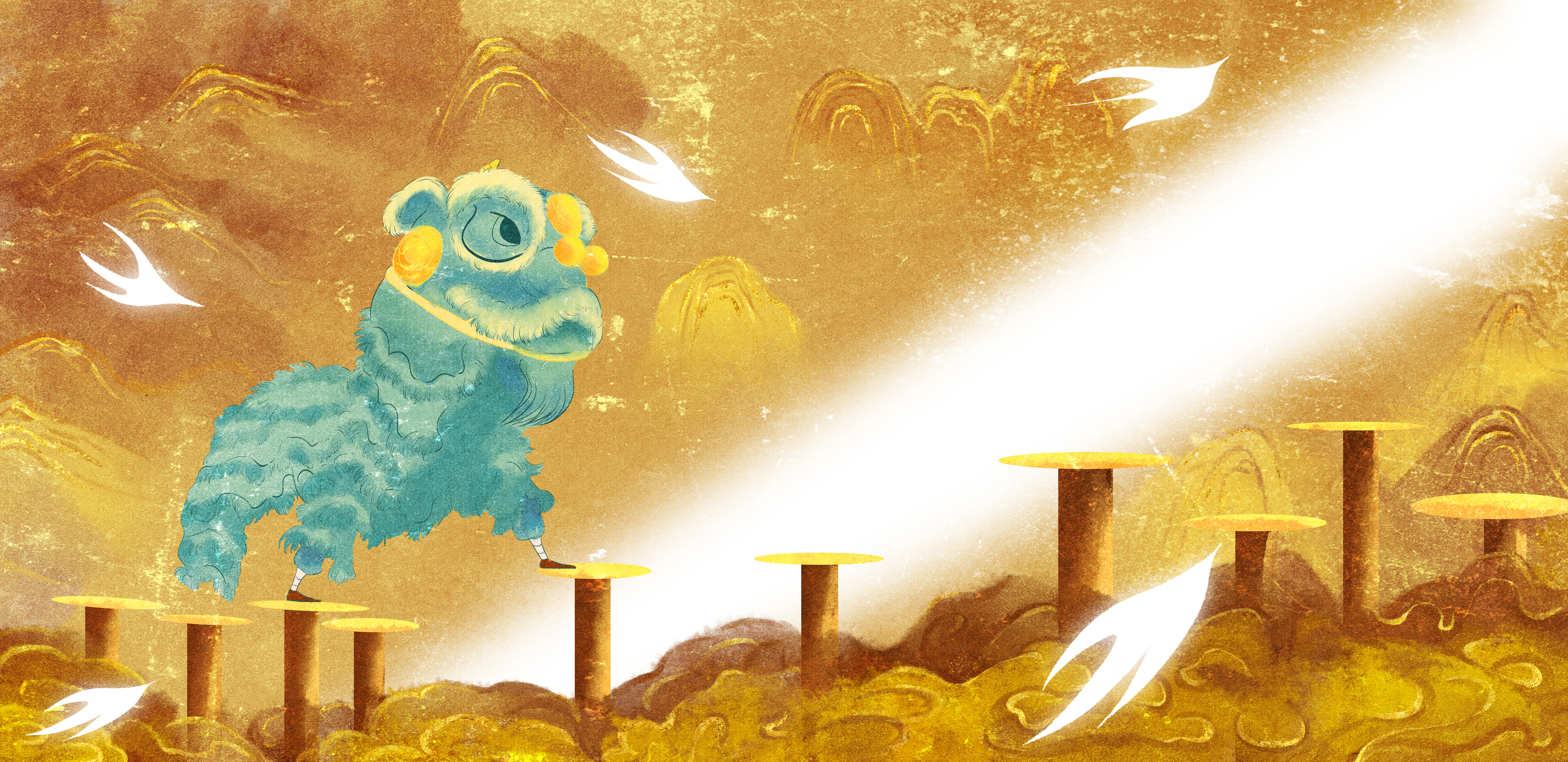 作品阐释:这个动画短片的创作是为了弘扬和传承中国传统民俗文化,所以选取了非物质文化遗产——舞狮进行短片设计。