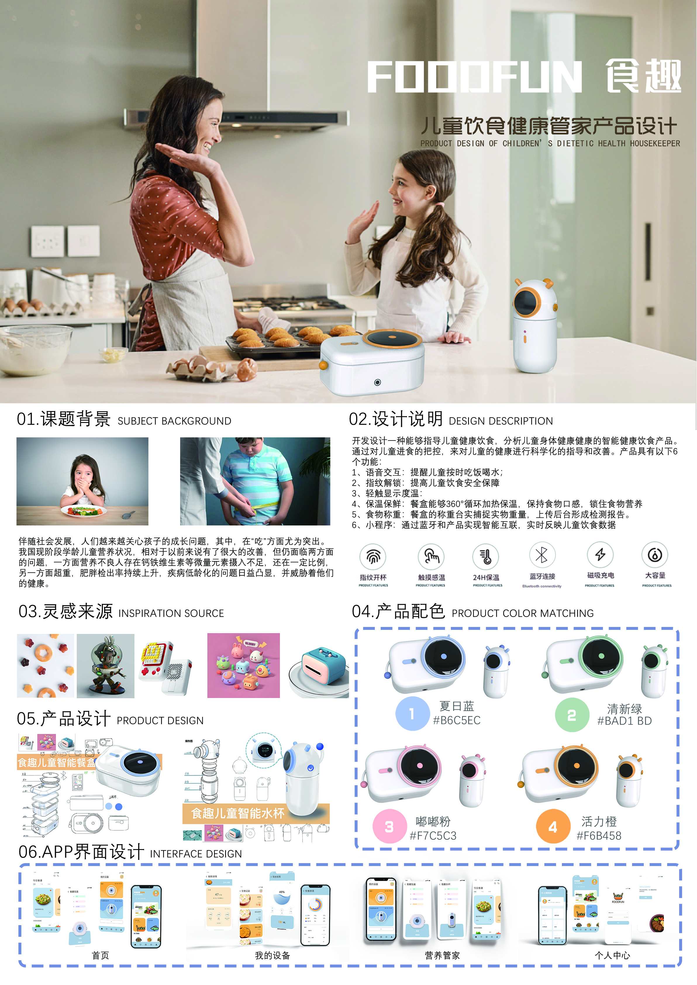 作品阐释:食趣儿童智能餐盒系列产品,是一款以产品与人之间的互动互联为切入点,从而达到指导儿童健康饮食,分析儿童身体健康的智能产品。产品具有语音交互、指纹解锁、轻触显示度温、保温保鲜、食物称重等功能。并通过小程序记录儿童日常饮食数据,来对儿童的健康进行科学化的指导和改善。在使产品具备情感化和趣味性同时,对儿童的在日常生活中使用时更有助益。