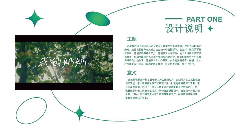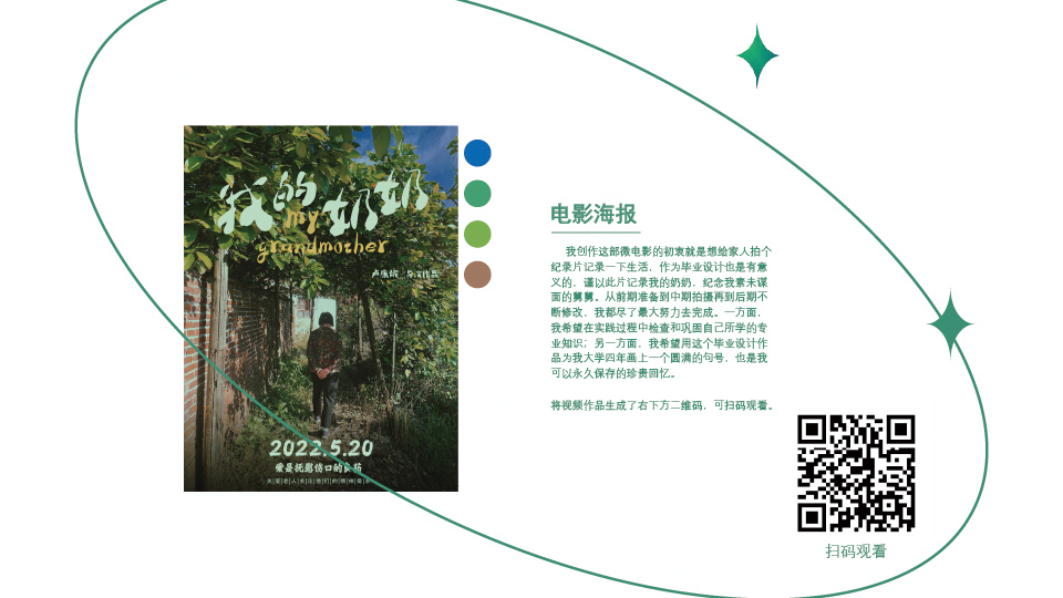 作品阐释:《我的奶奶》这部微电影是由真实发生在我们家的事情为原型,在这个基础上进行相应的改编。这部电影以“我”的叙述为主线,我的奶奶为主角,我的爸爸、妈妈、姨妈为配角,以舅舅离世为情绪爆发点展现了发生在奶奶身上的苦与甜。通过事件起、承、转、合的塑造表现了我的奶奶这个特定的人物,以小见大,呼吁社会关注老人的精神需求。