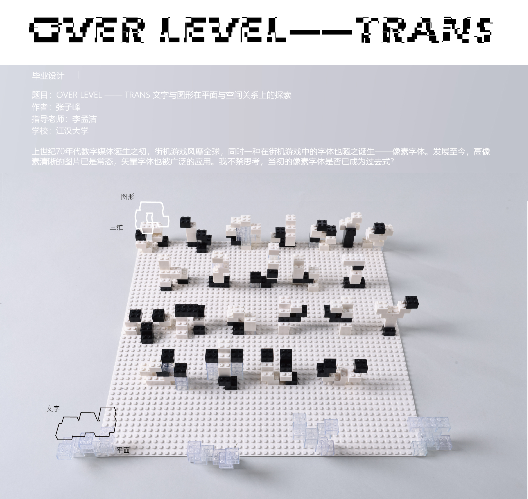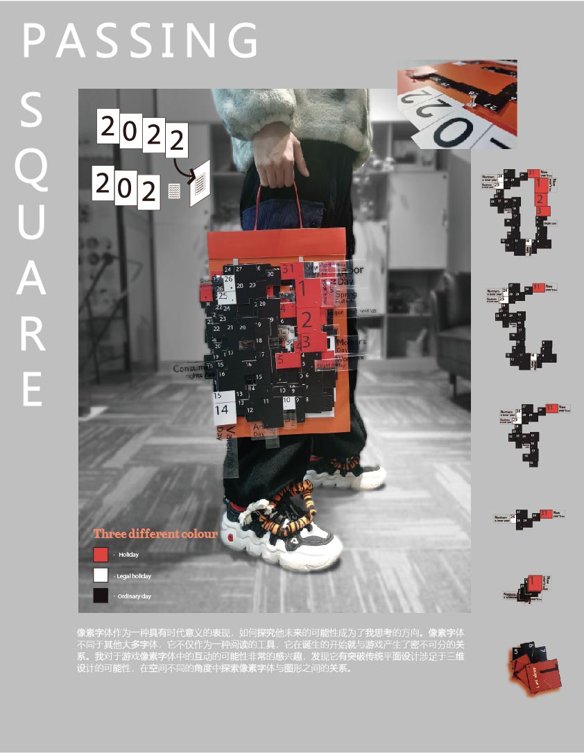 作品阐释:上世纪70年代数字媒体诞生之初,街机游戏风靡全球,同时一种在街机游戏中的字体也随之诞生——像素字体。发展至今,高像素清晰的图片已是常态,矢量字体也被广泛地应用。我不禁思考,当初的像素字体是否已成为过去式?