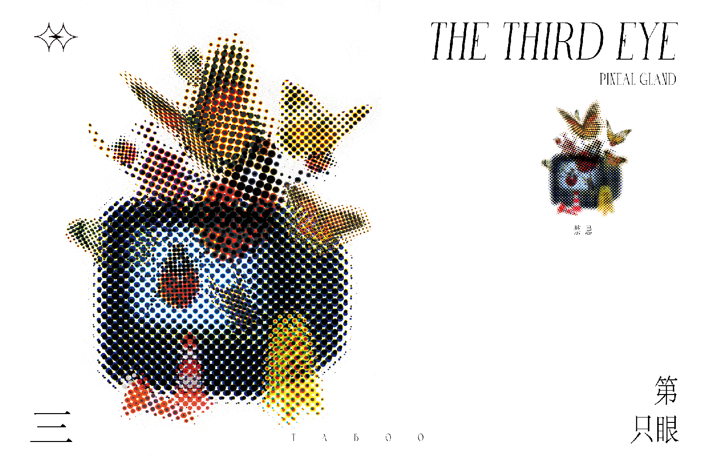 作品阐释:《第三只眼》围绕着自我的意识与感受展开。通过第三只眼去“看”其实是一个自我向内观看的过程,也就是所称的“内观”,在这个过程中,日常所思所感经过大脑无意识的推理演变,产生出不确定的飘渺的图像,这既是潜意识的纯粹表现,也是现实的延伸。尝试利用微观像素点特性,在模糊、混沌的观感体验里建立一种特殊的视觉秩序,将内观过程中的三个层次——具象的物质,内外感知的意象,能量的共振状态视觉化。在自我独有的感官维度,找寻内在符号和现实与虚幻间的关联。