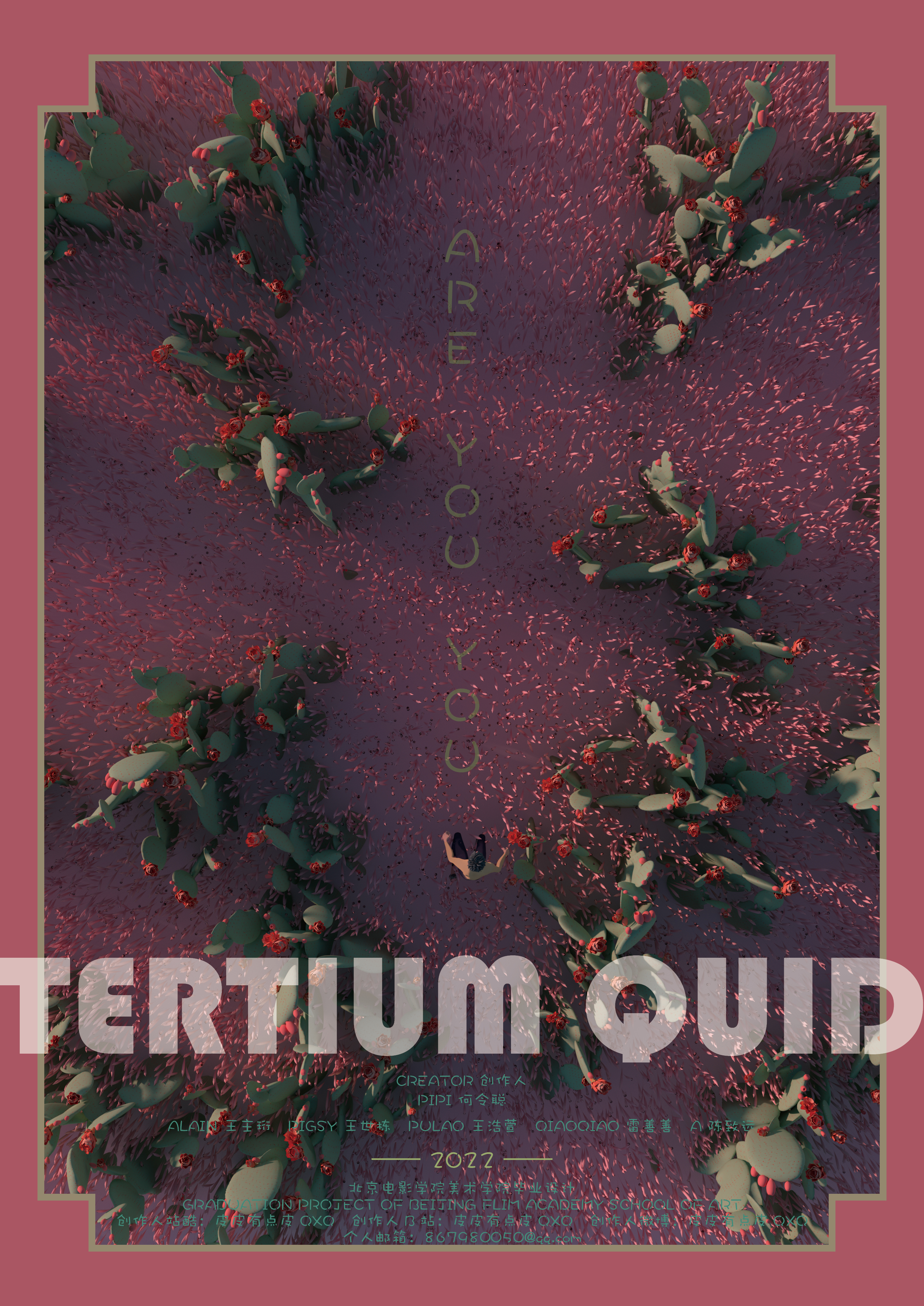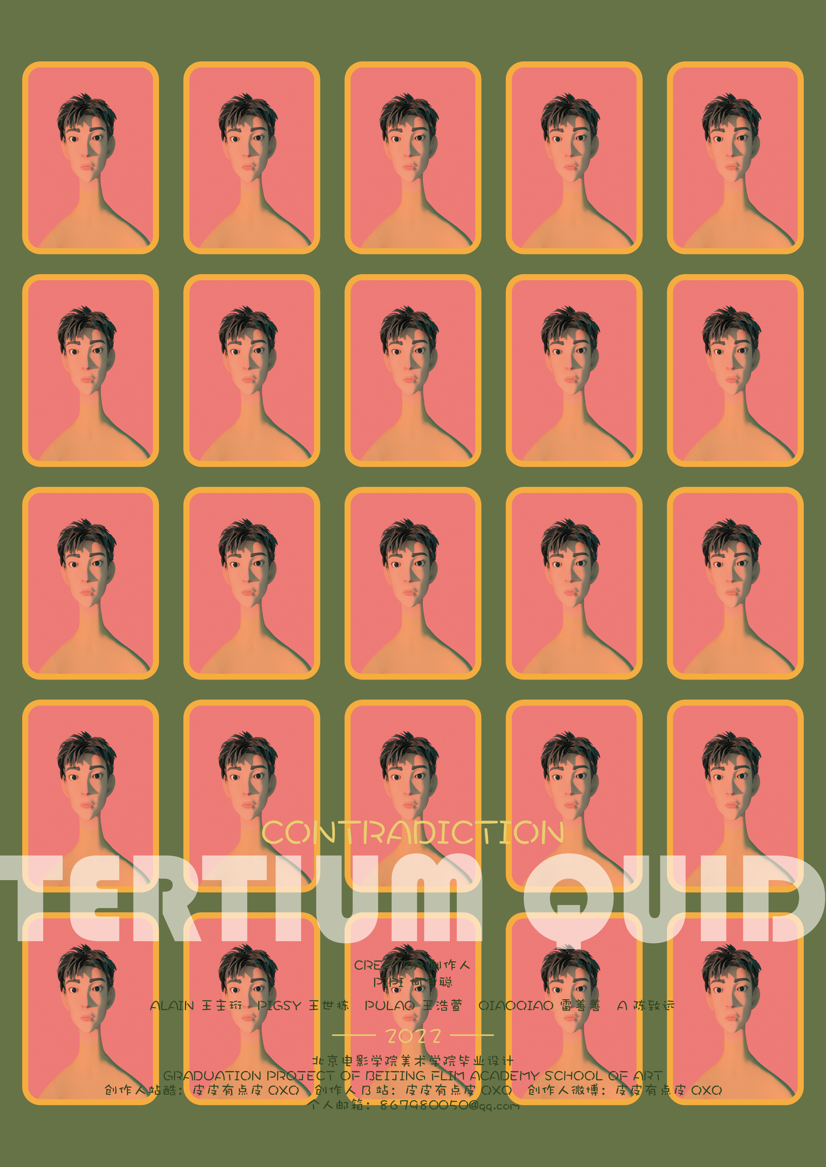 作品阐释:我的短片《Tertium quid》,构建了一个完全理性社会,展现了在这个架空的世界,社会集权和社会集体意识对于个体人的认识、情感和意志的改变;人如同行尸走肉在这个表面光鲜亮丽的世界,逐渐失去自我,使我变成了你,你变成了我,我和你又变成了他,最后变成了Tertium quid,翻译成中文便是“他”少了一撇——“ta”。