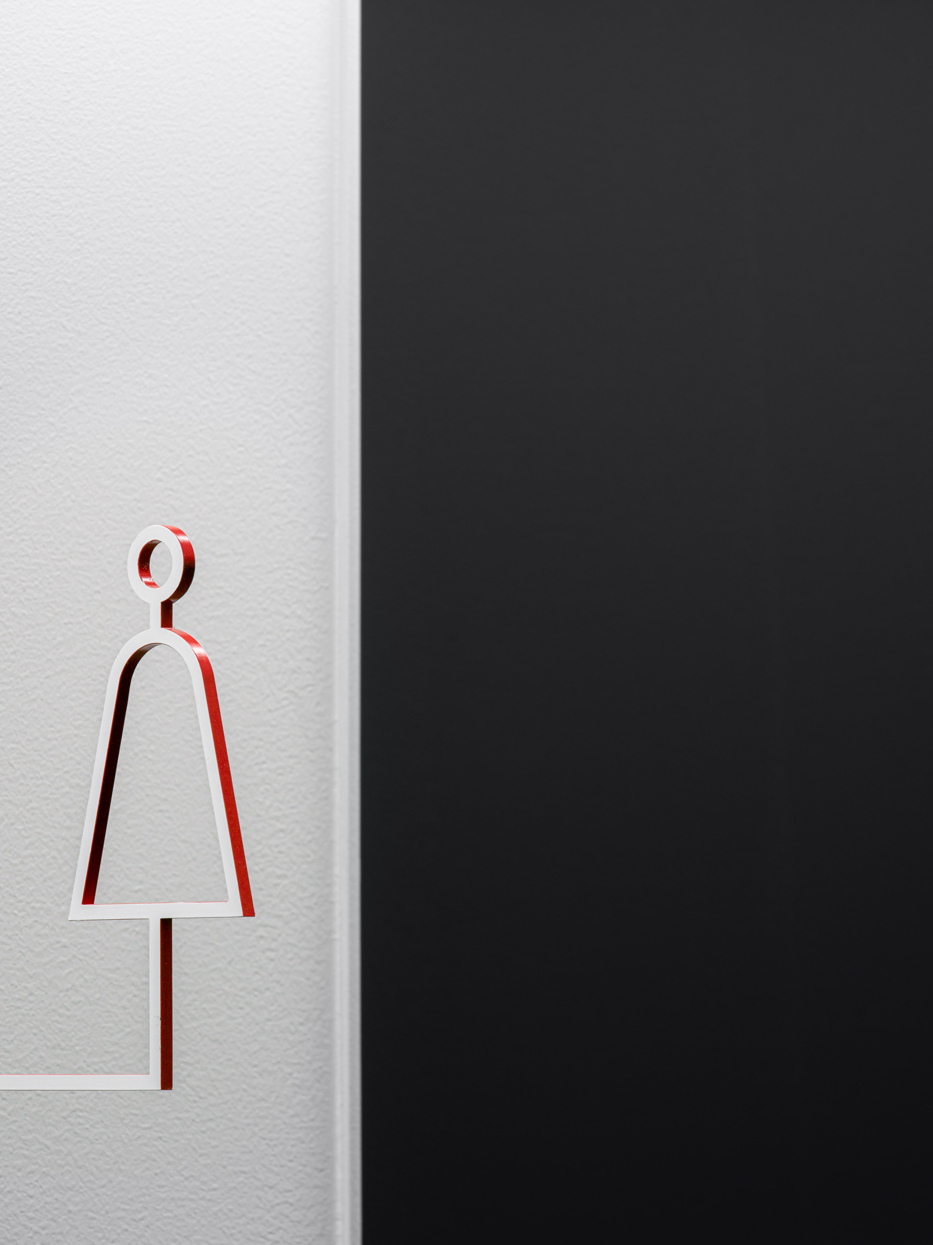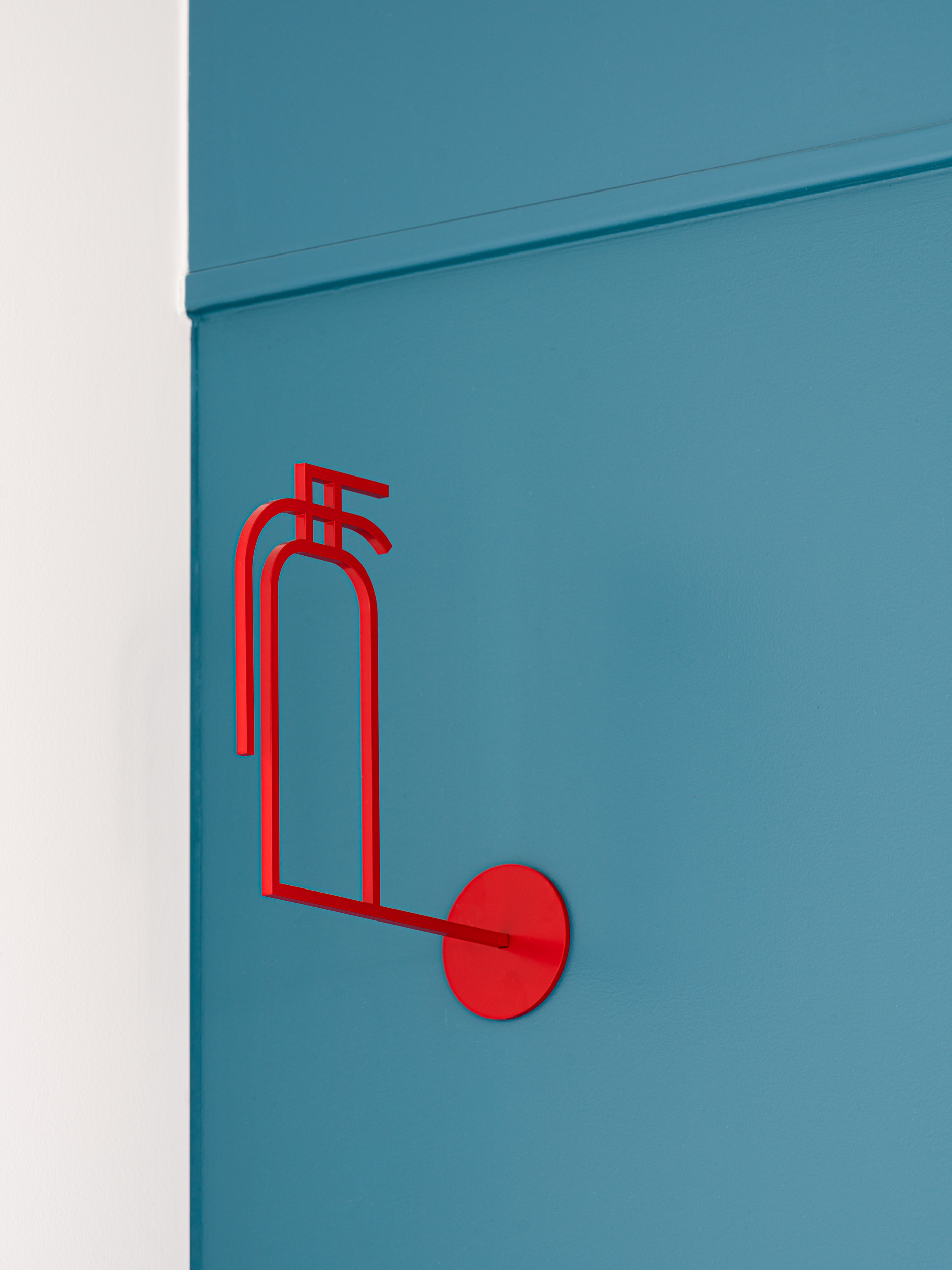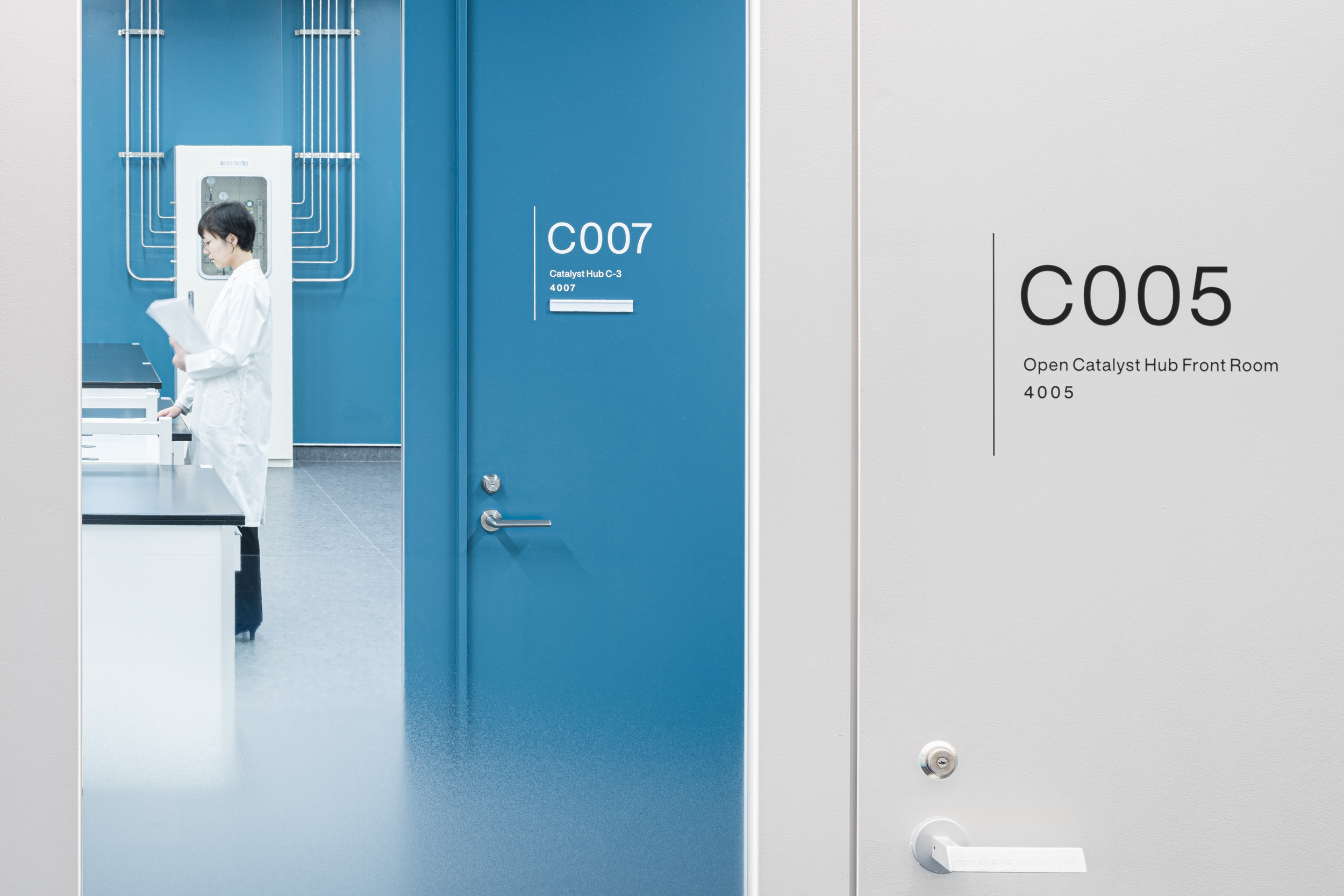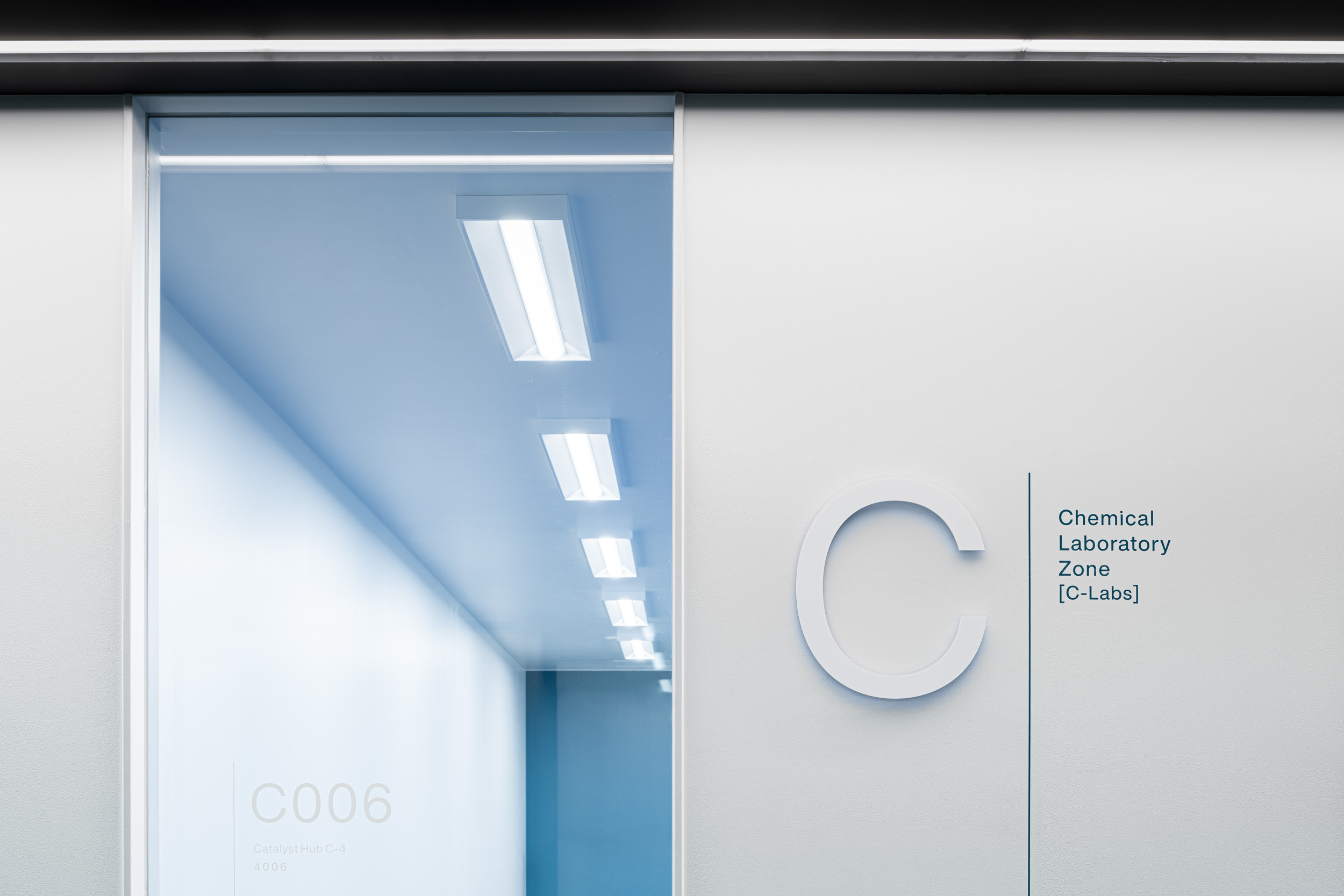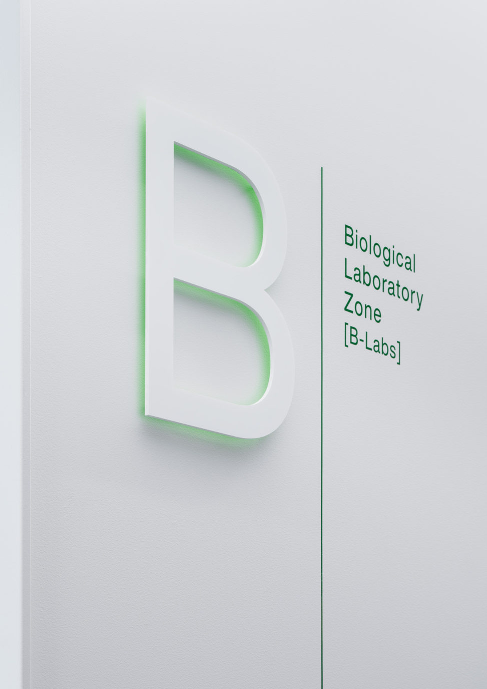 其主要实验室区域是一个空间组合,Hokkyok设计了简洁的标牌样式,考虑到了可视性和安全性。为了进行区域划分,标牌横截面使用彩色,正面为白色,使得侧面的颜色映衬在白色墙面上,以简单的方式引人注目,打造了简洁、专注的实验环境。
