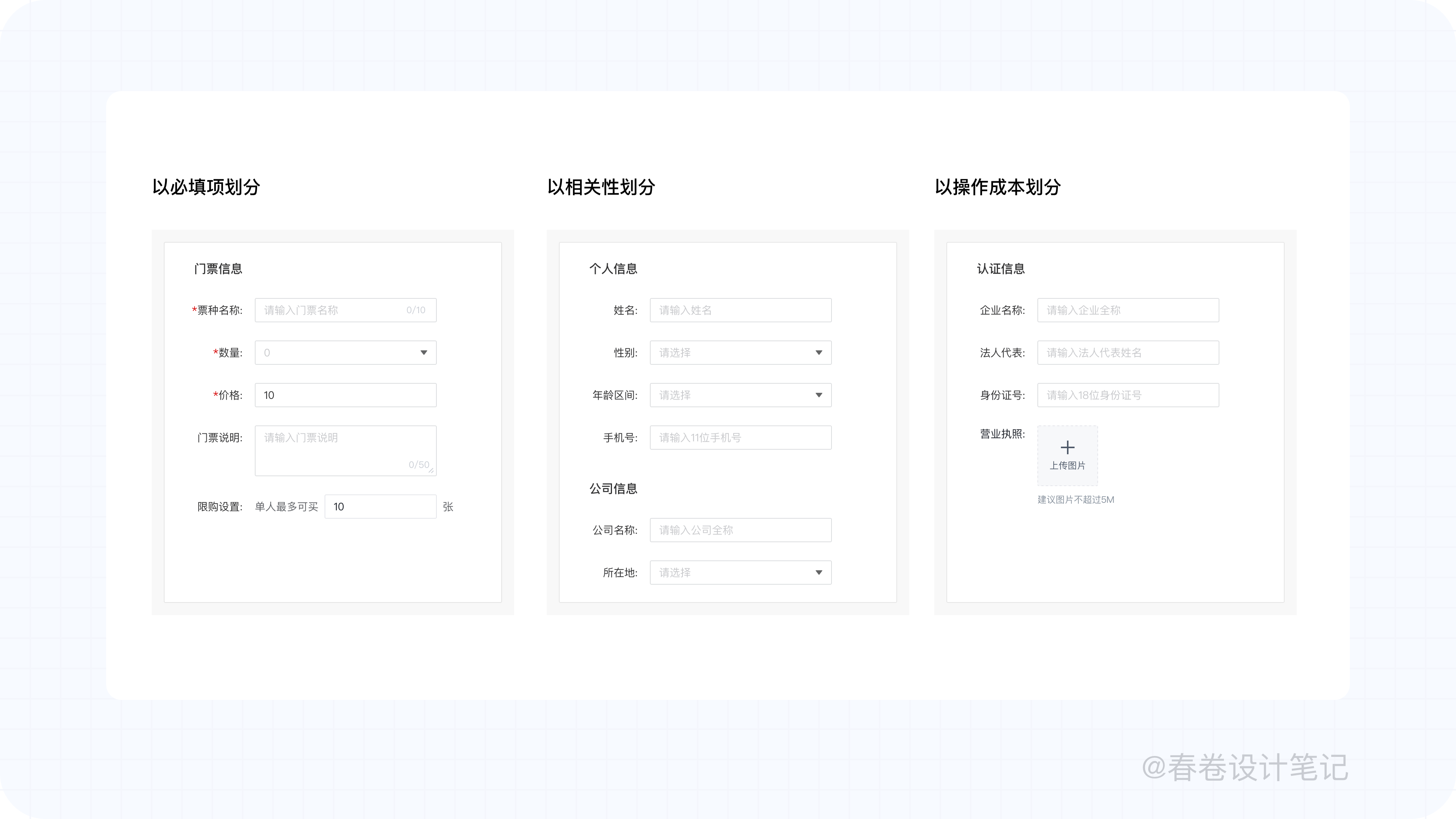 以操作成本划分:若录入项间的操作存在差异或用户对需要录入的内容的信息获取途径存在难易之分,可将易录入或易获取信息的录入项放在表单靠前的位置,优先展示。该种方式有助于降低用户的录入门槛。