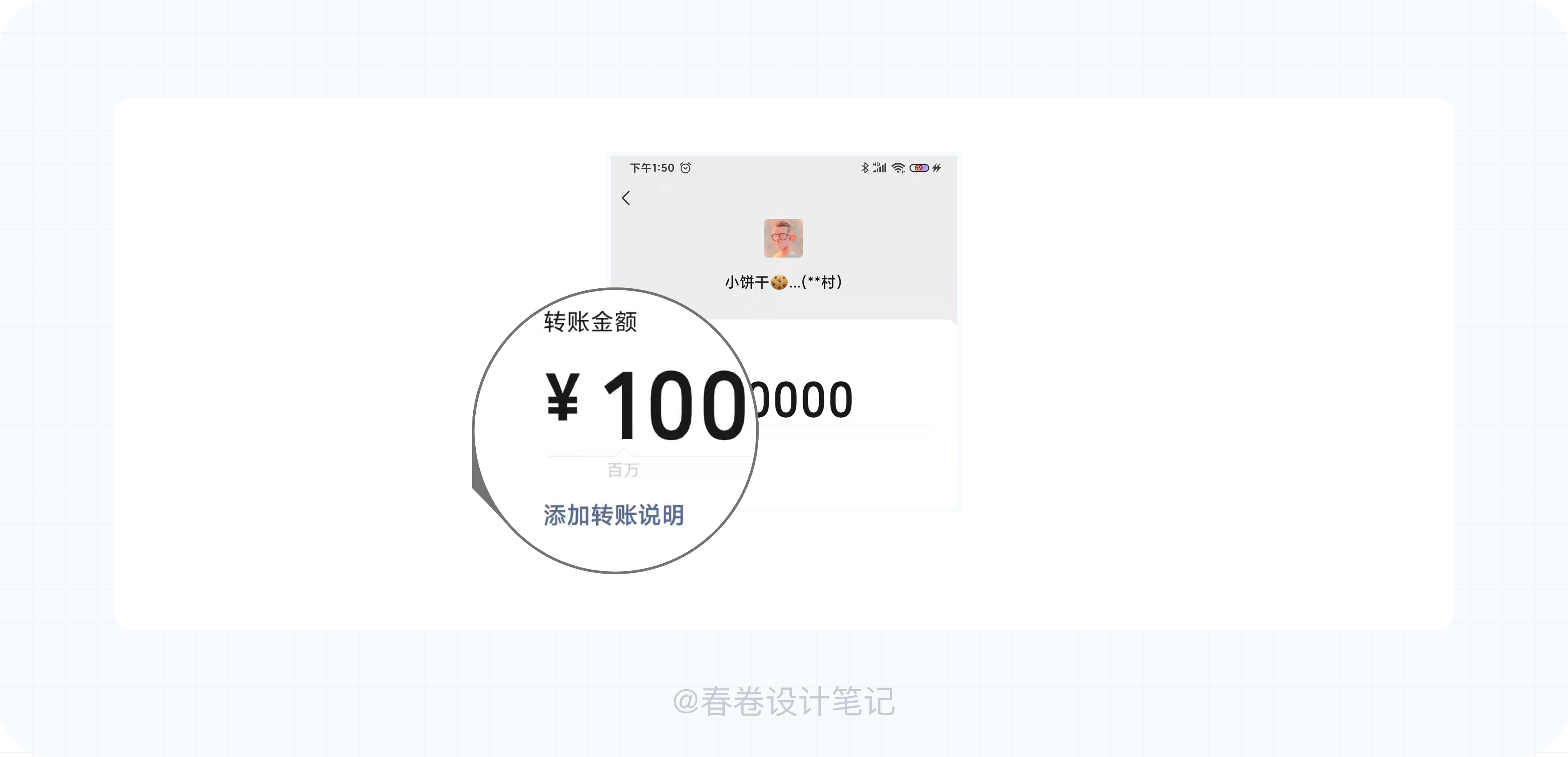 在交易场景,对于填写较大金额的数字录入时,比如富婆充值美容卡的时候,对于大金额的交易,可以将金额转译成汉字给予用户提示。