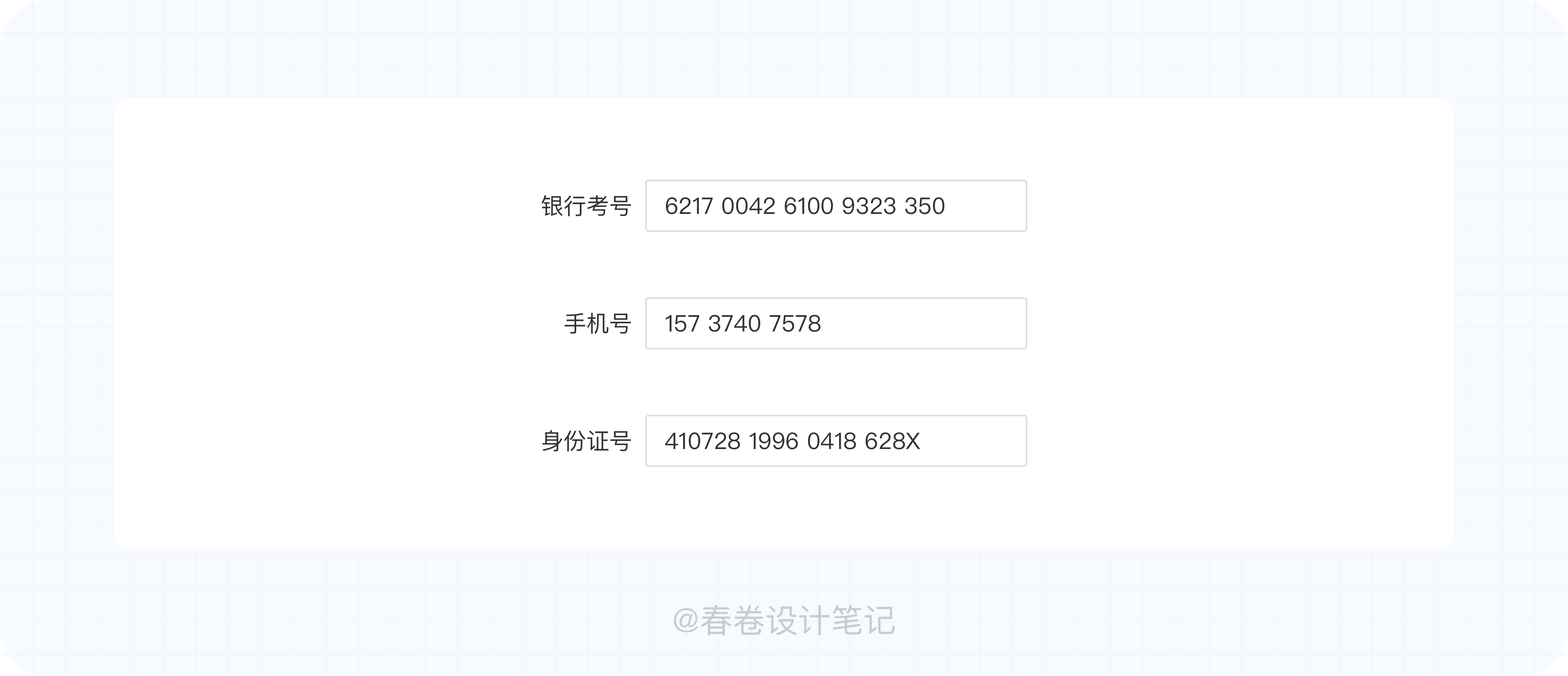 允许用户按照习惯输入,但系统自动格式化。如身份证号、银行卡号,在填写银行卡号时,自动增加分位符便于用户核实;在输入电话号码时,增加电话号码的隔位符,便于用户检查数字填写的是否正确。