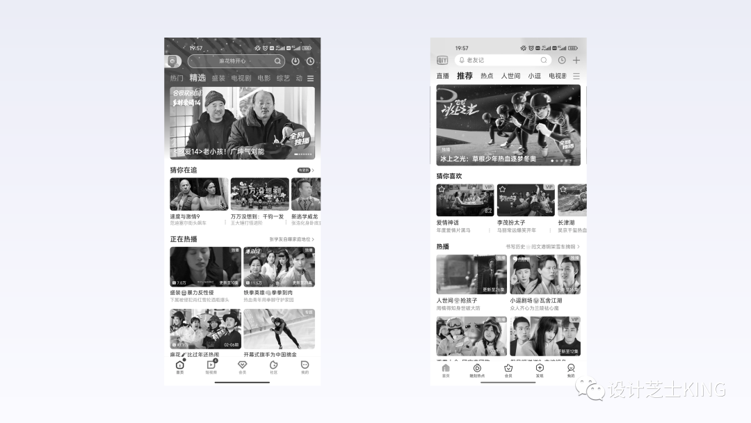 目前的APP同质化现象严重,下图是两个知名长视频APP的首页,如果我们去掉颜色同时去掉页面中的logo,不告诉你这是哪个 App,可能你也难以区分这些 App,图标也存在同样的问题