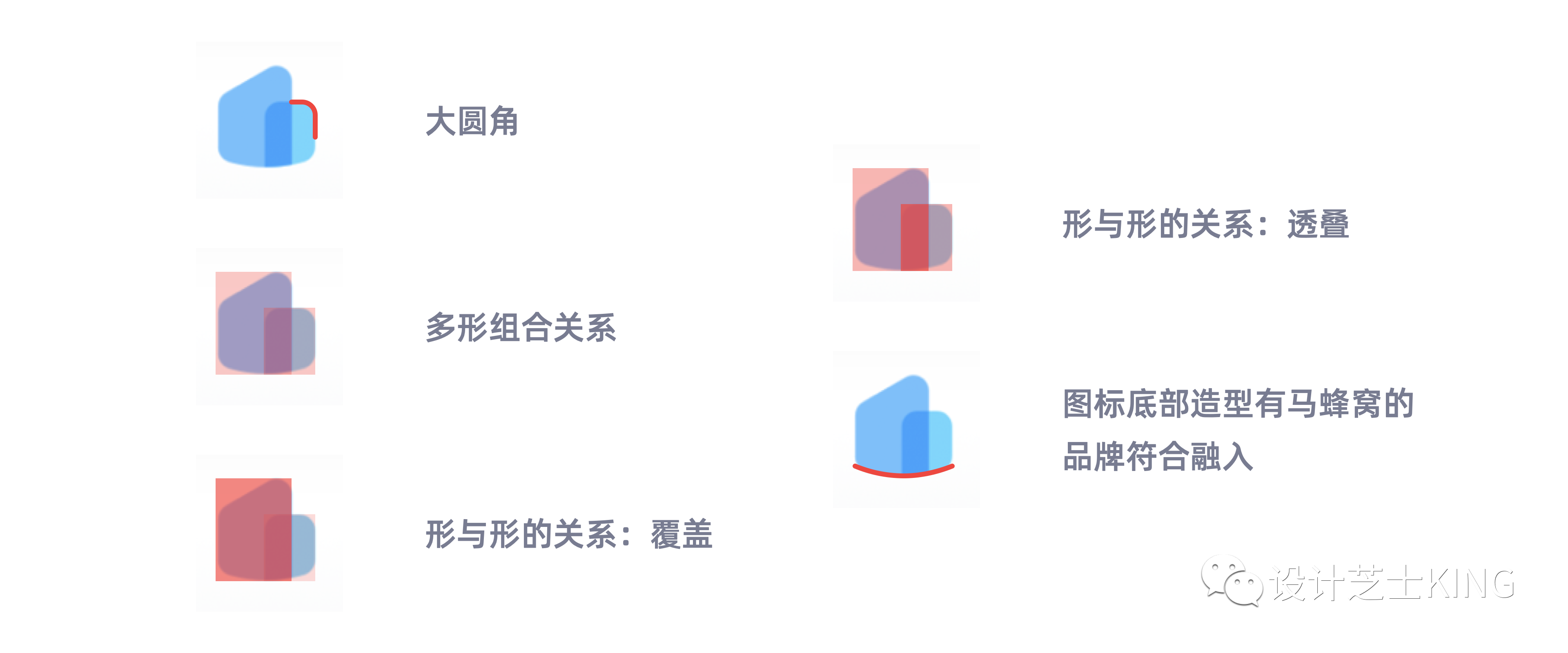本次优化的这一组五个图标在圆角,颜色渐变幅度,质感(毛玻璃),投影,形与形的关系(覆盖,透叠)等细节上均保持一致