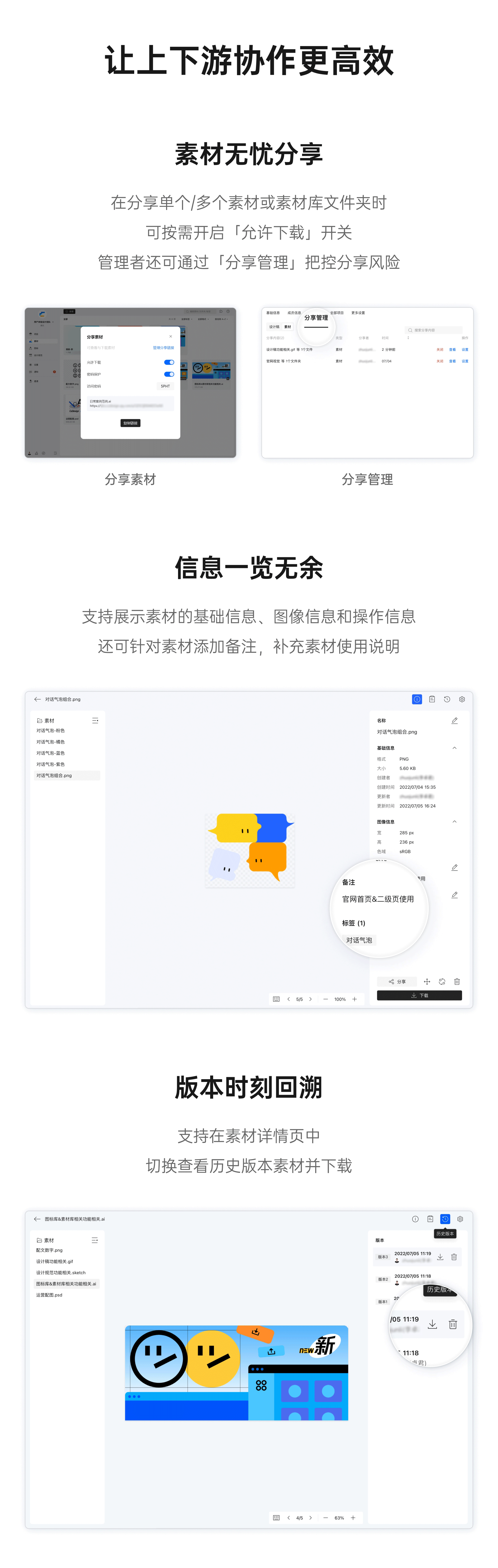 支持文件夹嵌套管理、素材分享、标签筛选,让你轻松管理团队设计资产,还能在线存储并预览 PSD、AI 等更多设计源文件!