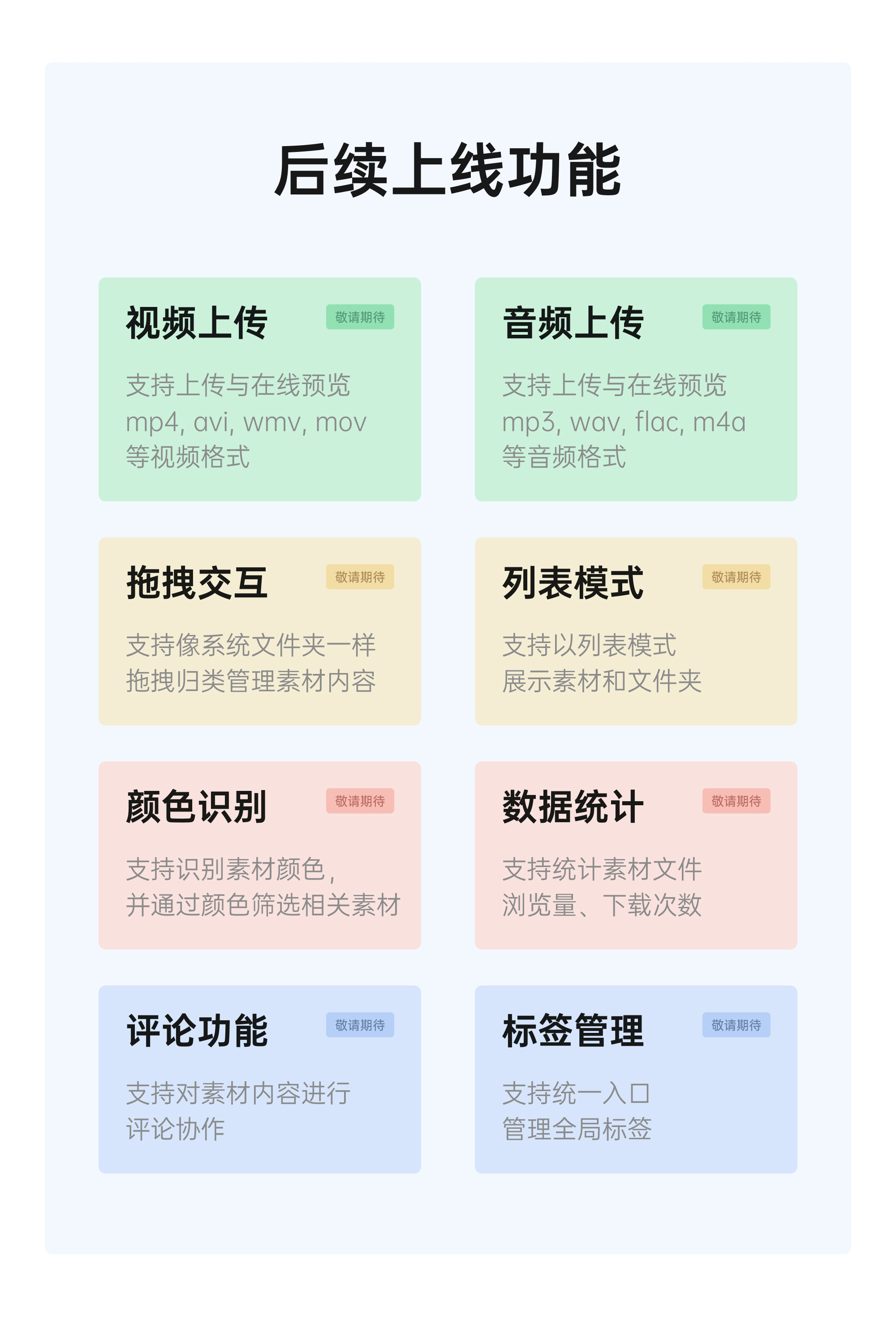 8月份将支持上传音视频文件和 3D 文件……更多素材库的全新功能,将陆续上线,敬请期待!